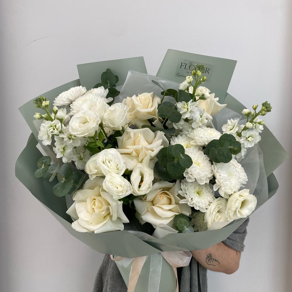 Matthiola - 3 pcs Chrysanthemum bush - 2 pcs Eucalyptus - 1 pcs Rose - 5 pcs Eustoma - 2 pcs