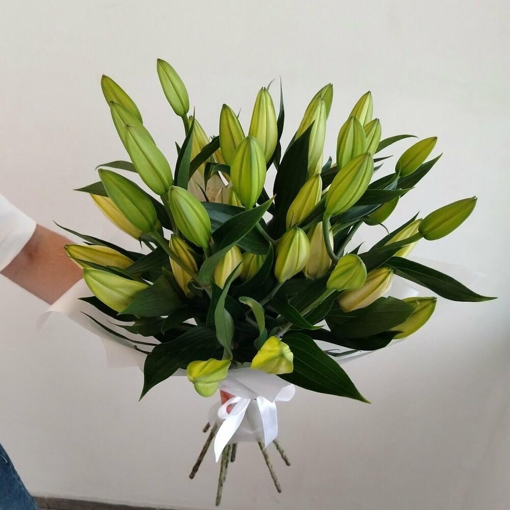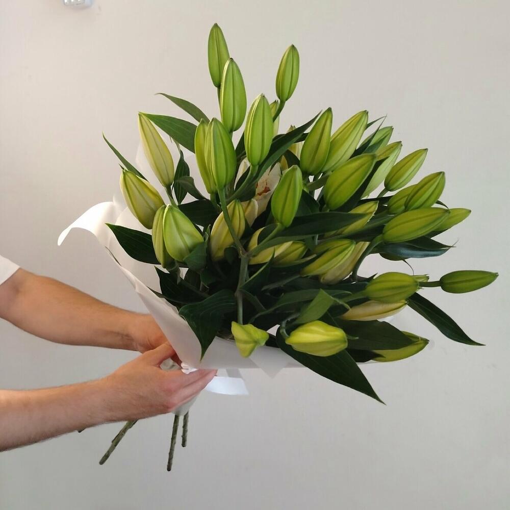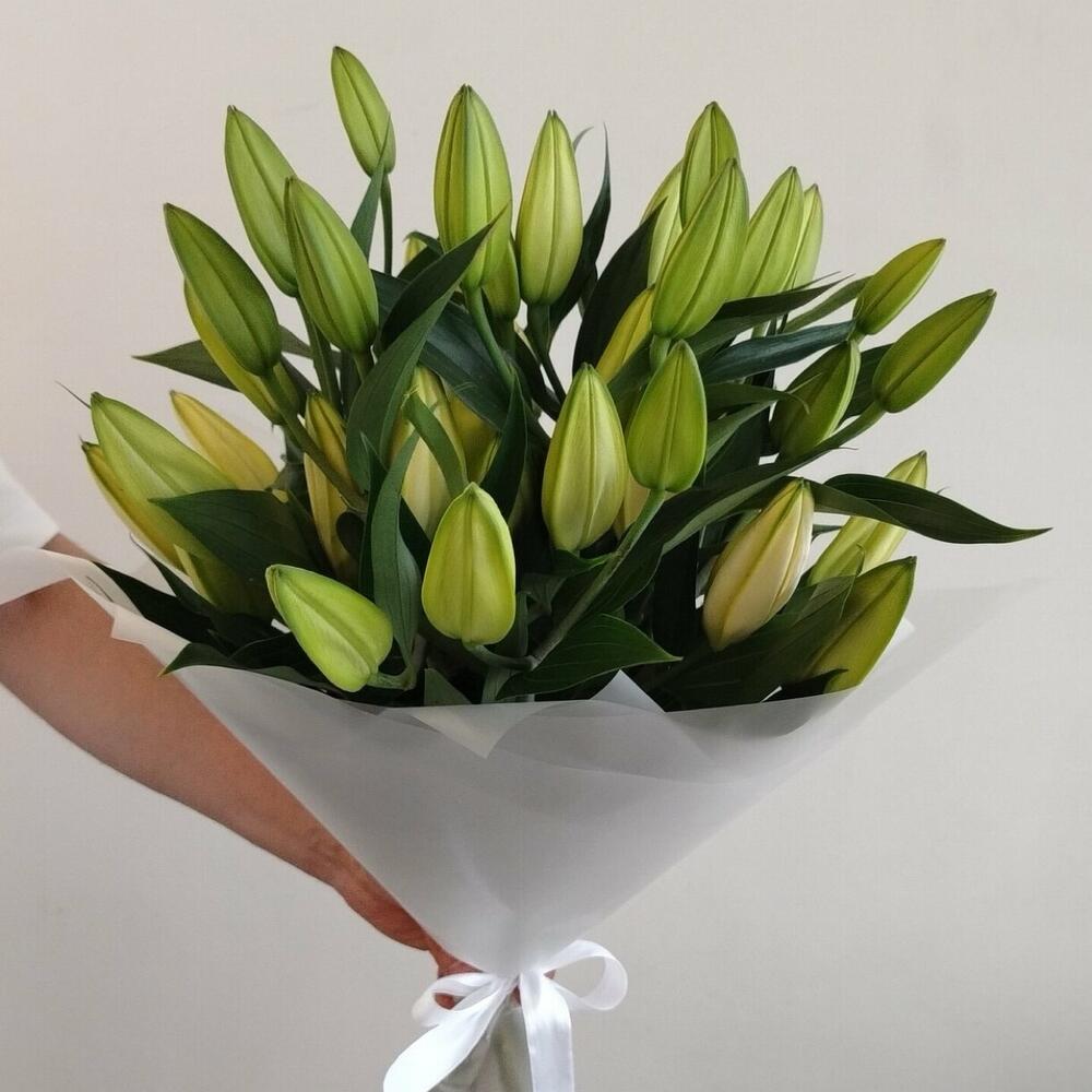 Свежие бутоны белых лилий в стильной упаковке — утончённый букет с ненавязчивым ароматом и элегантным настроением.