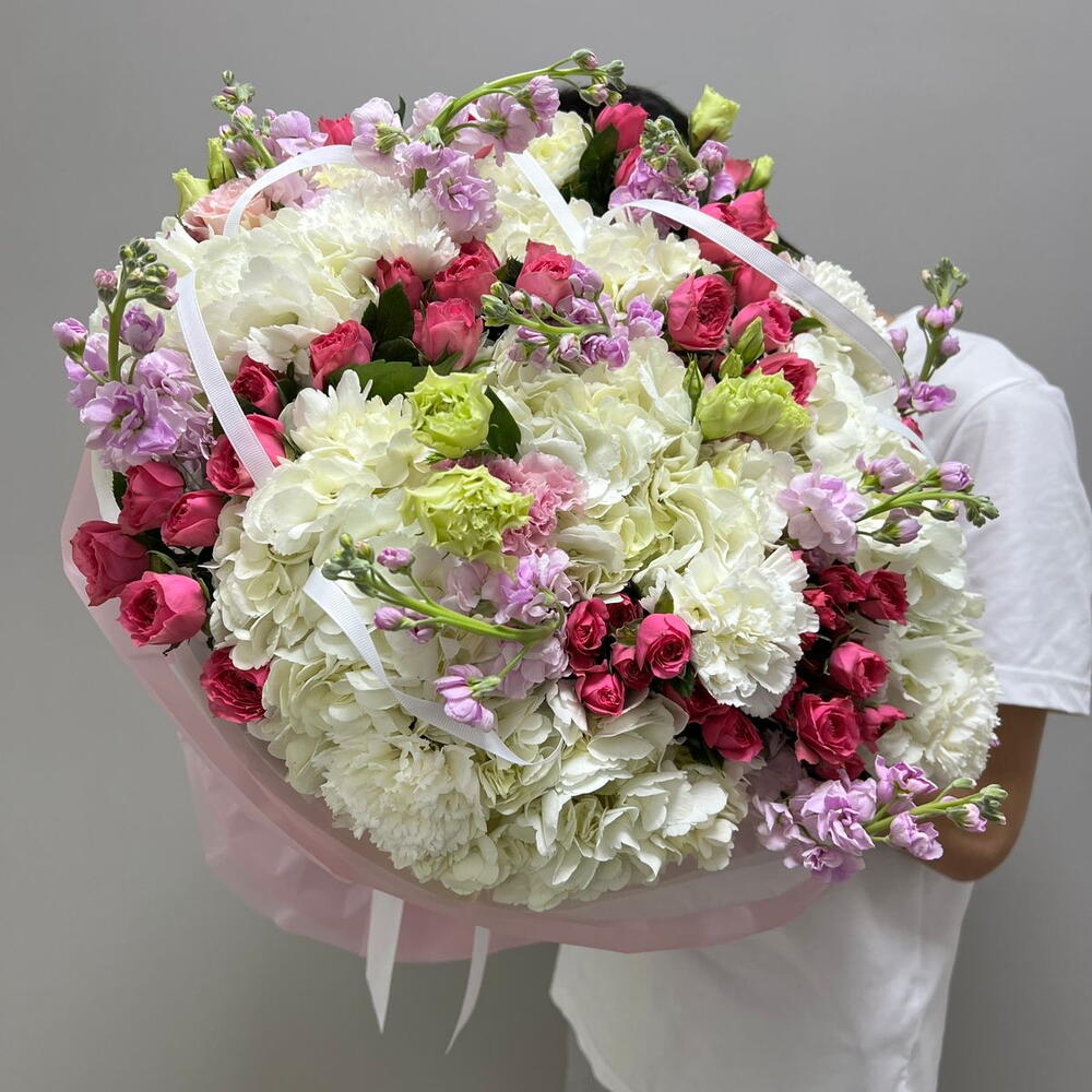 Hydrangea - 9 pcs Matthiola - 10 pcs Carnation - 9 pcs Eustoma - 5 pcs Bush rose peony - shaped - 9 pcs