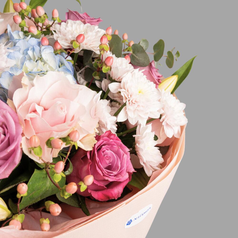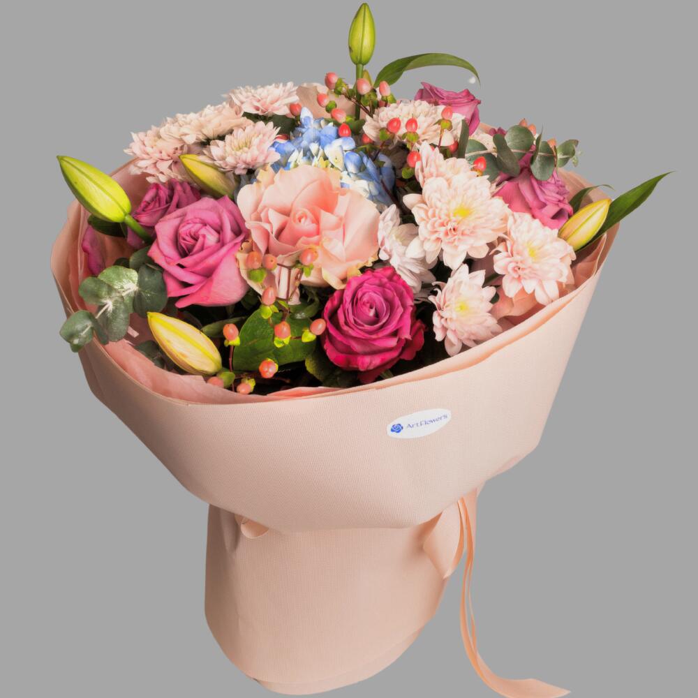 Hypericum - 5 pcs Hydrangea - 1 pcs Lily - 3 pcs Rose - 10 pcs Chrysanthemum - 3 pcs