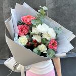Hypericum - 1 pcs Eucalyptus - 2 pcs Bush chrysanthemum - 1 pcs Peony - shaped rose - 2 pcs mix rose - 3 pcs