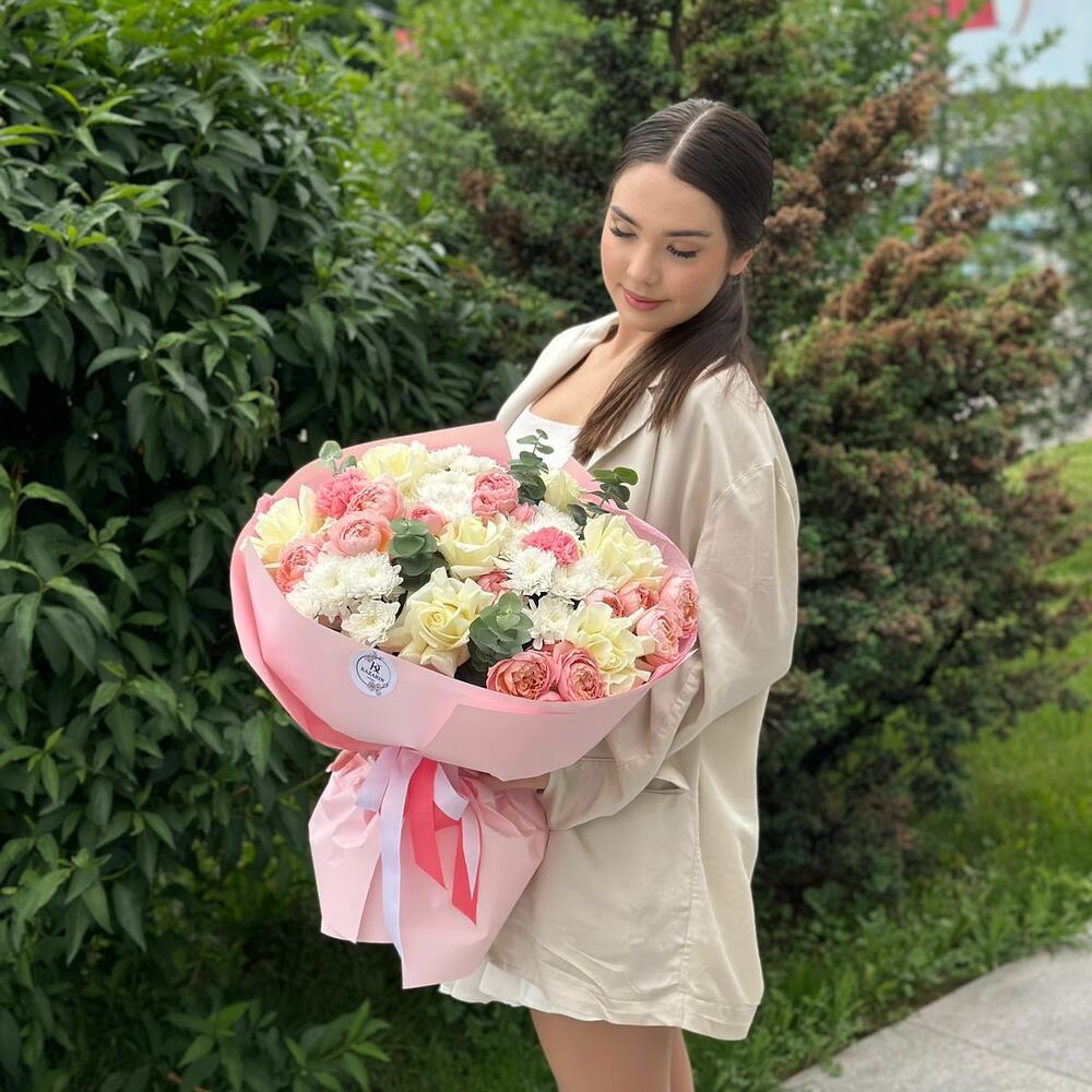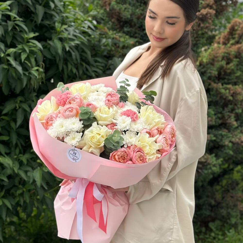 Chrysanthemum bush - 7 pcs Eucalyptus - 3 pcs Rose of France - 7 pcs juliet rose peony - 5 pcs