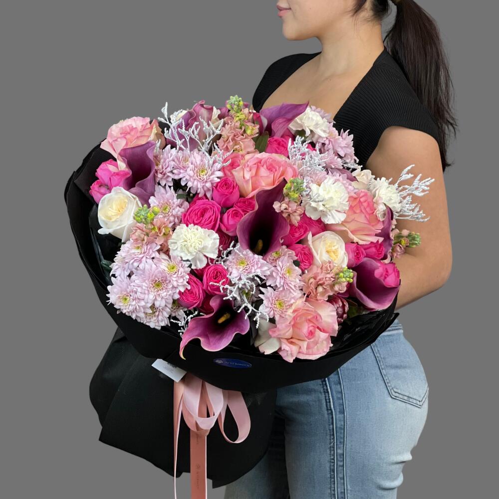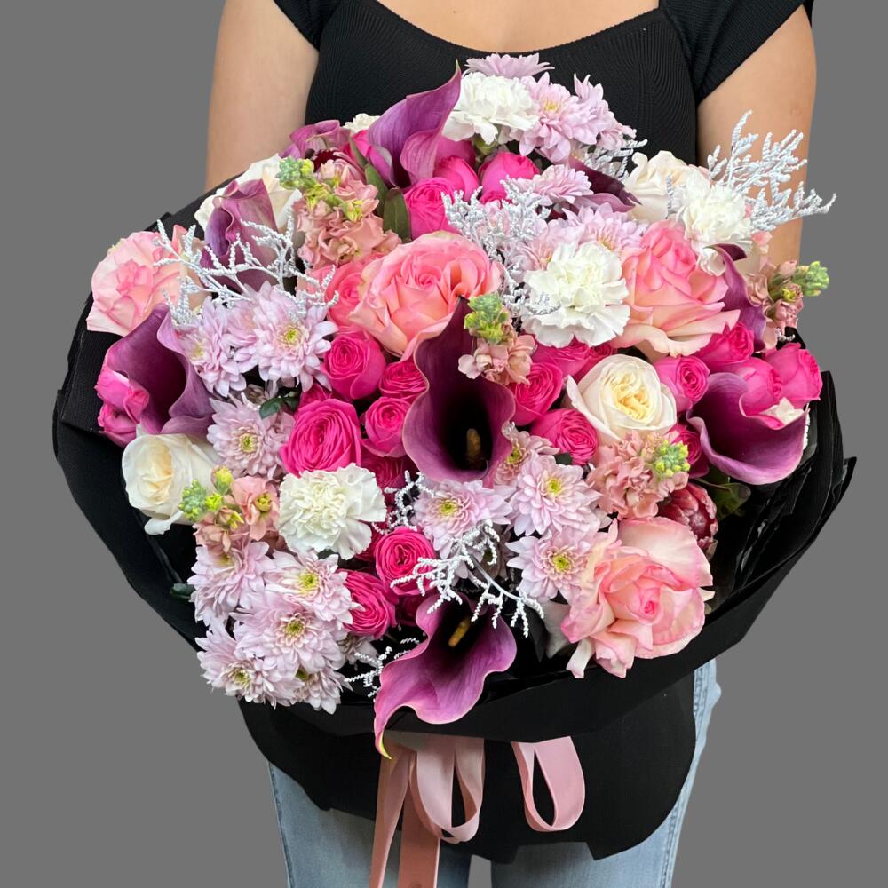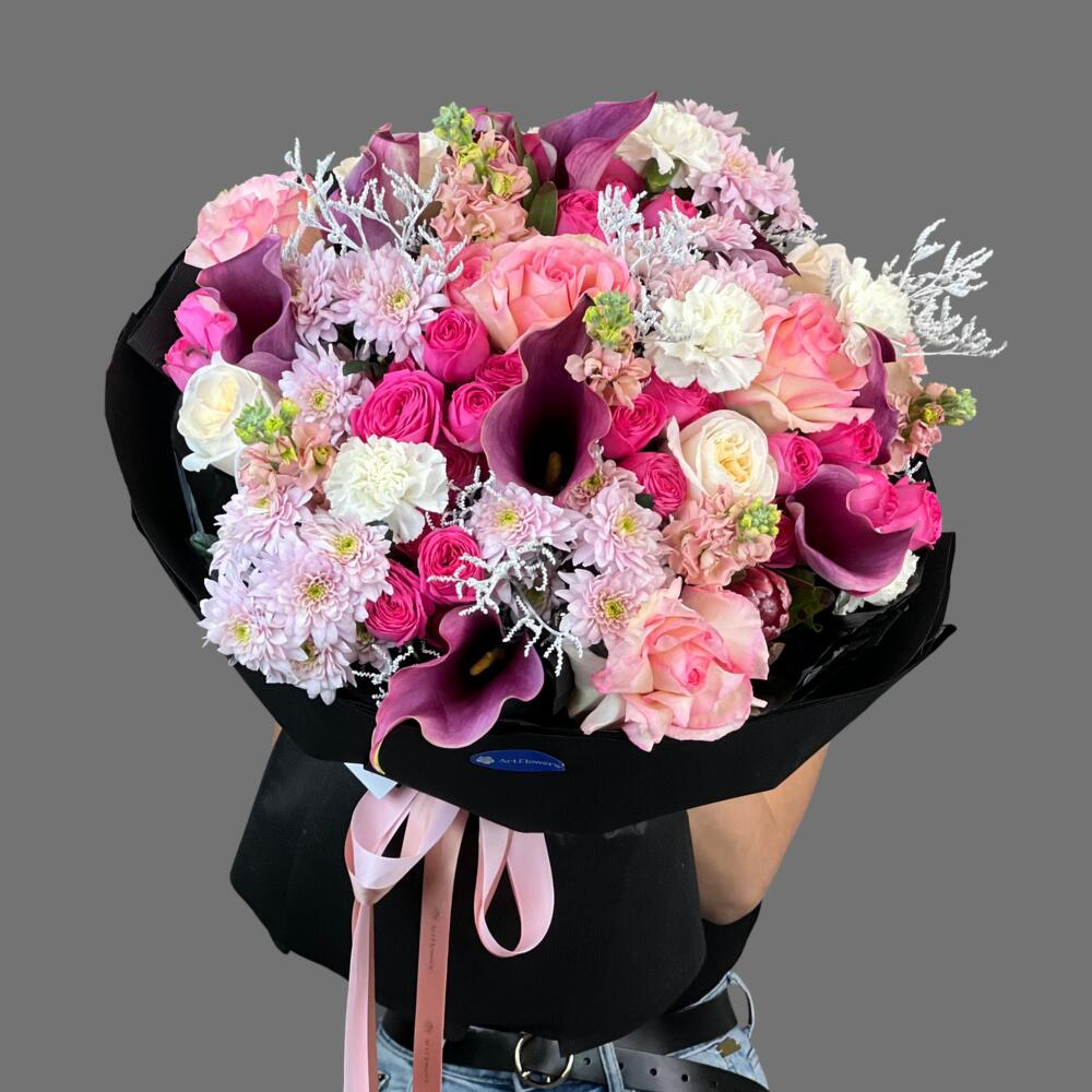 Limonium - 4 pcs Matthiola - 5 pcs Protea - 2 pcs Chrysanthemum - 5 pcs Carnation - 5 pcs Rose Juliet - 5 pcs Dutch Rose - 7 pcs peony - shaped roses - 5 pcs calla lilies - 9 pcs