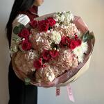 Hypericum - 1 pcs Matthiola - 2 pcs Eucalyptus - 1 pcs Chrysanthemum - 1 pcs Dianthus - 1 pcs hydrangeas - 5 pcs bush roses - 4 pcs