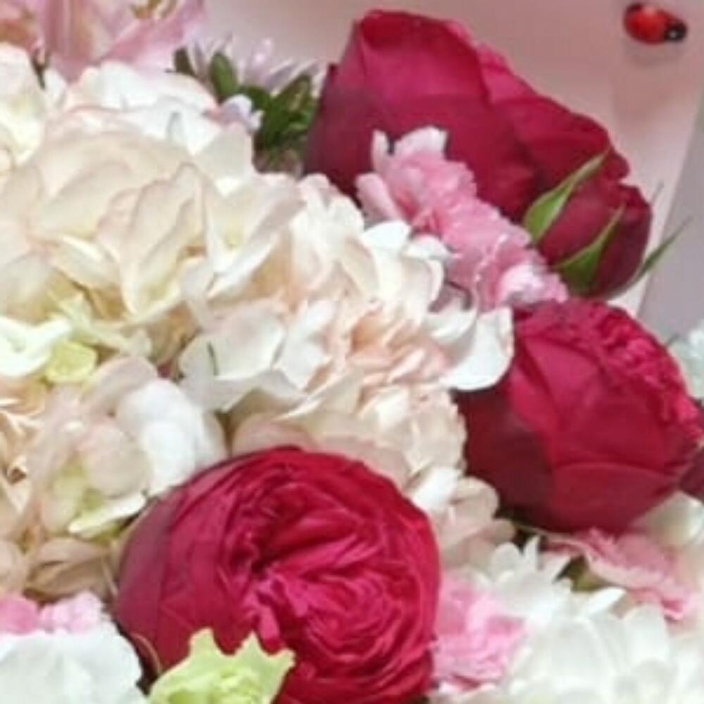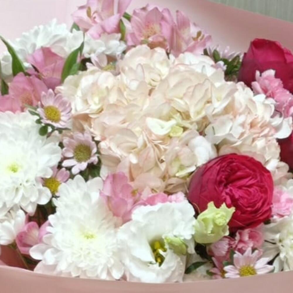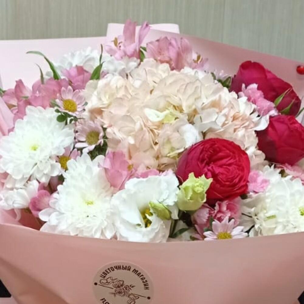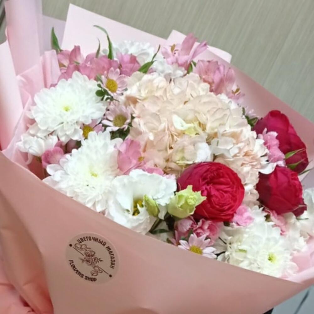 Chrysanthemum bush white - 3 pcs Pink hydrangea - 1 pcs Peony rose red - 3 pcs альстромериямикс европа - 3 pcs
