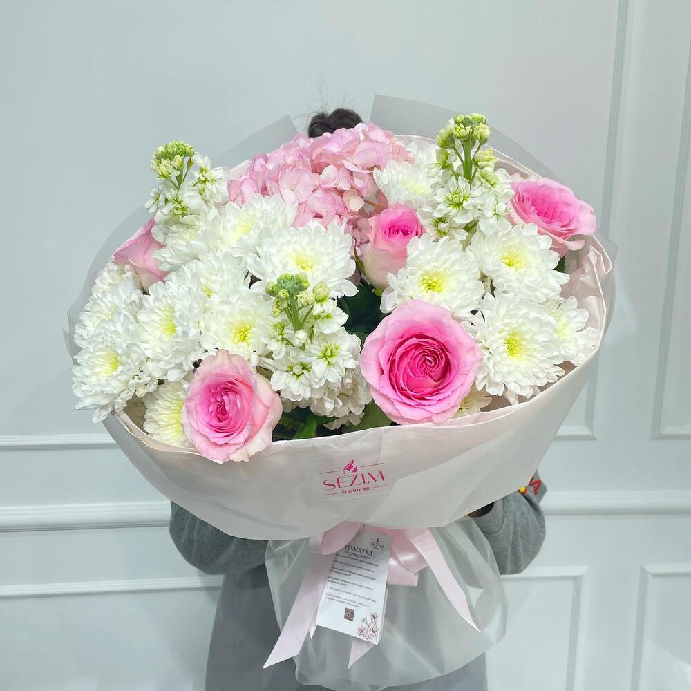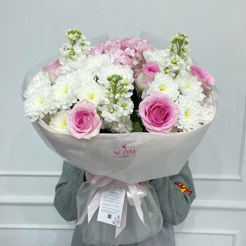 Hydrangea - 1 pcs Matthiola - 3 pcs Rose - 5 pcs Chrysanthemum - 4 pcs