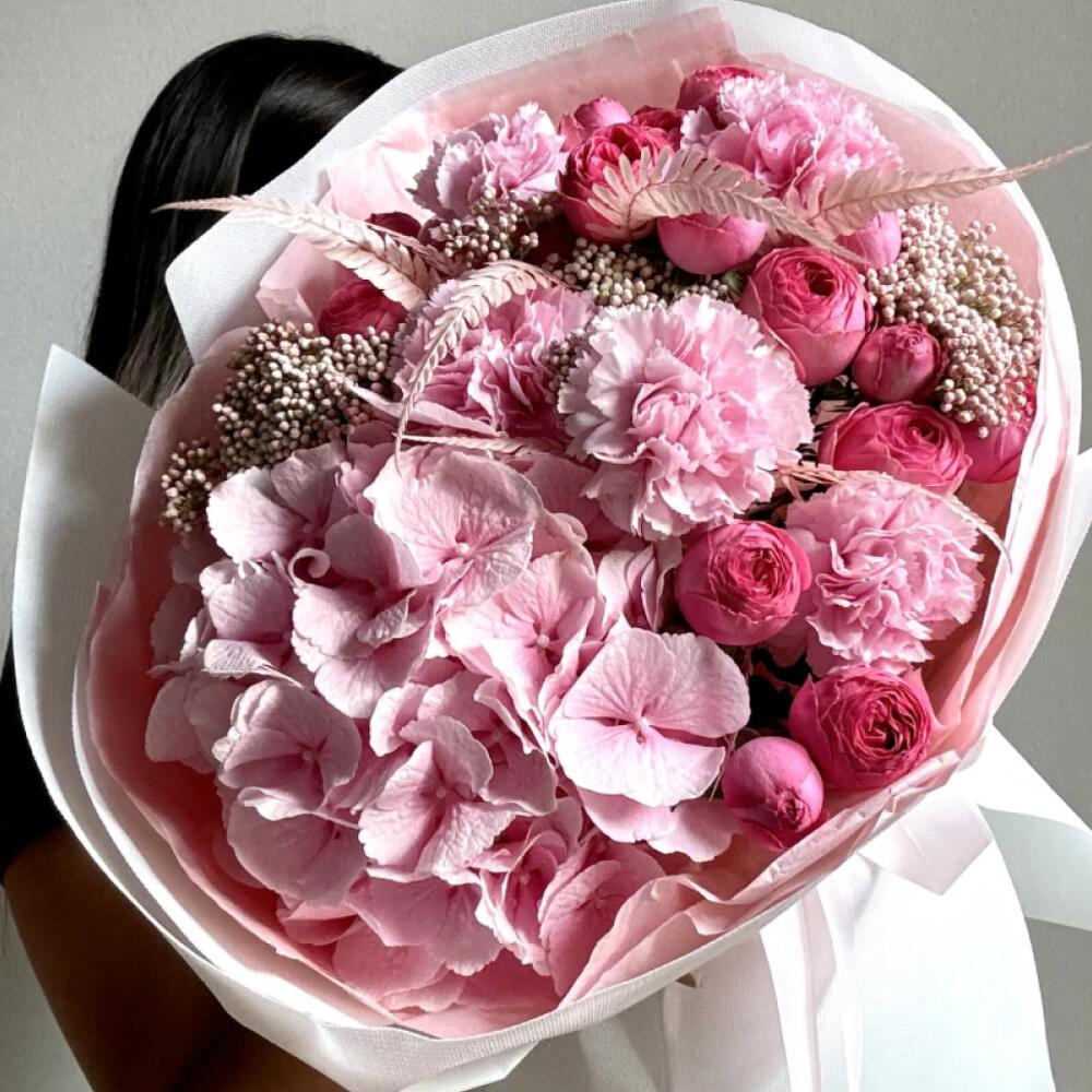 Hydrangea - 1 pcs Ozothamnus - 3 pcs Carnation - 5 pcs роза (silva pink) - 5 pcs