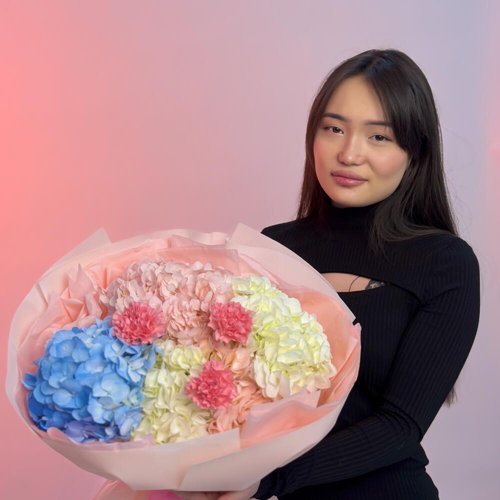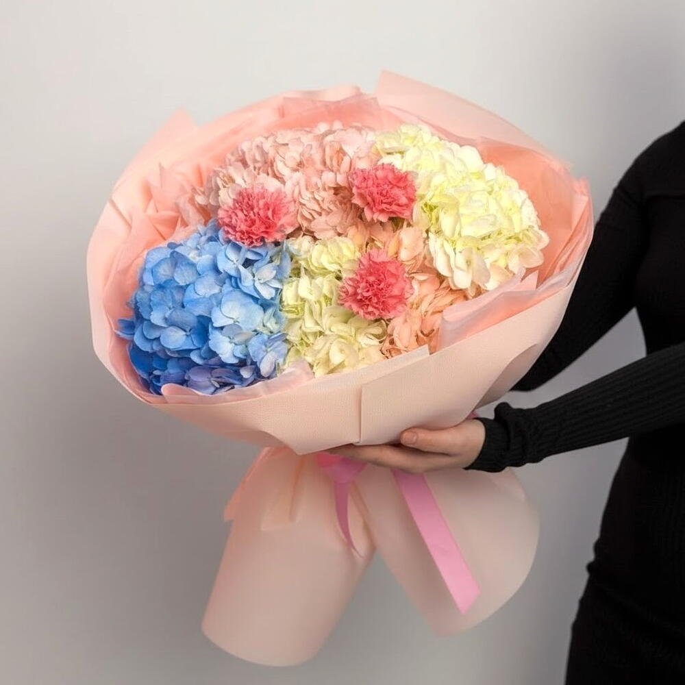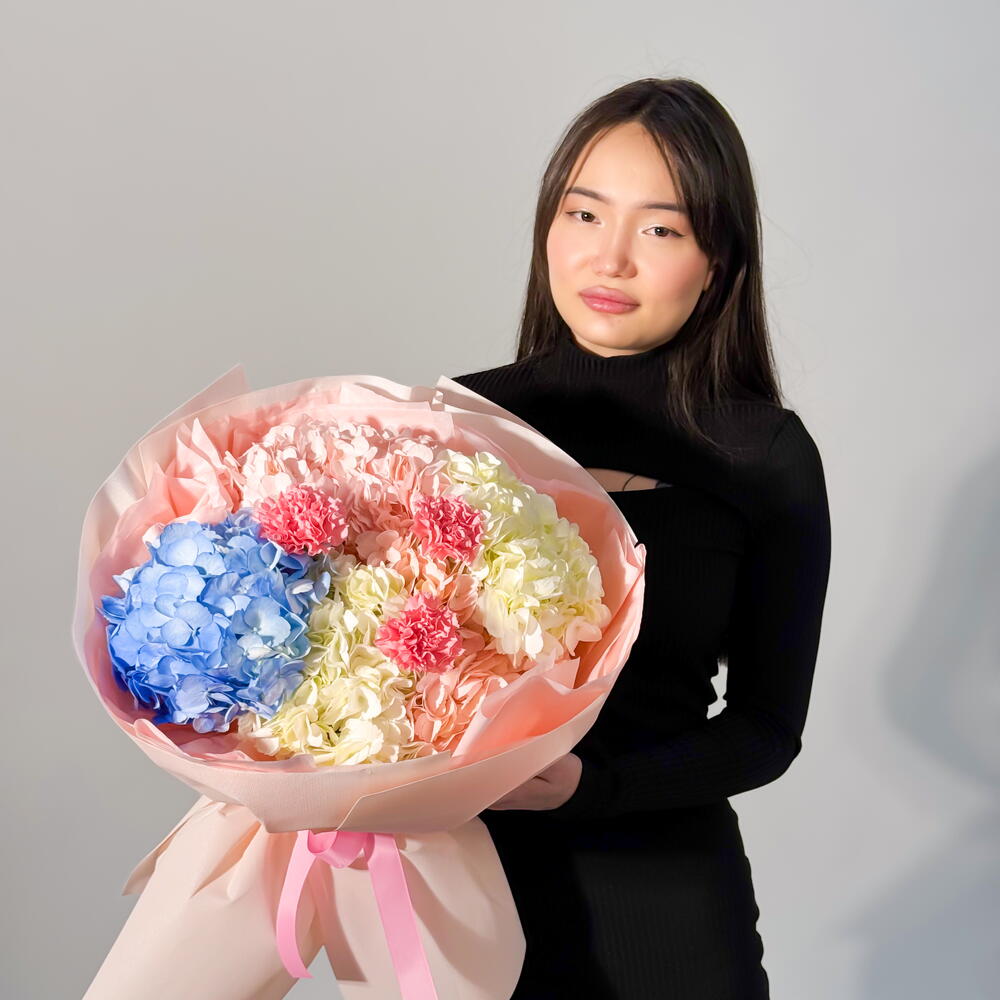 This bouquet seems made of delicate clouds — soft pastel shades fill it with a special coziness and warmth. Airy hydrangea blooms in blue, cream and peach tones are harmoniously complemented by touching accents of carnation. The arrangement looks very light, romantic and modern, drawing the eye with its soft color palette. Such a bouquet will make an ideal gift to express care, gratitude or sincere feelings. It is perfect for a birthday, a maternity hospital discharge, or simply to delight a loved one. Care instructions: re-cut the stems before placing them in a vase, use clean cool water and change it daily. Place the bouquet away from direct sunlight, heat sources and drafts.