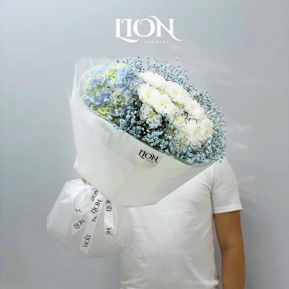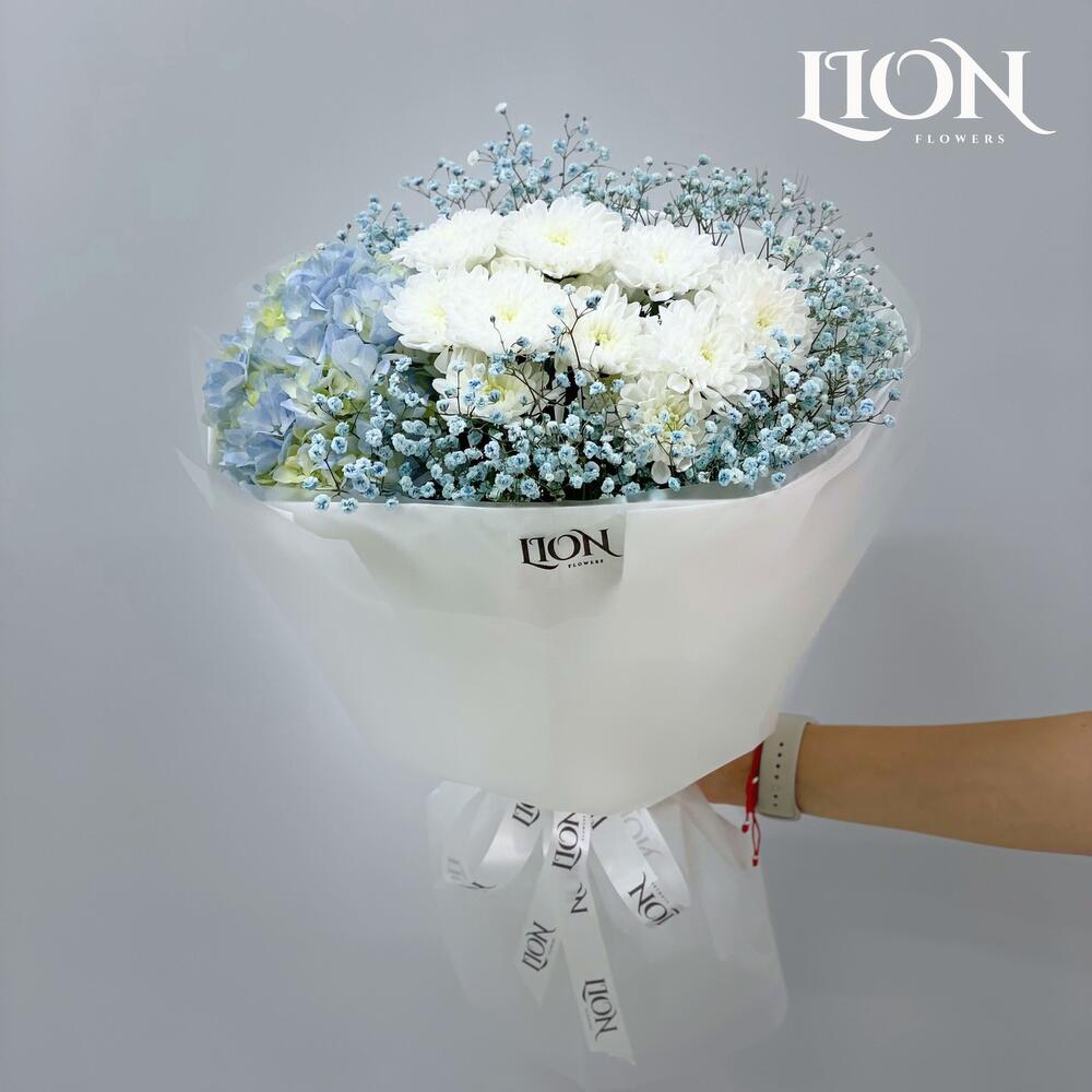 Chrysanthemum bush white - 2 pcs Blue hydrangea - 1 pcs Gypsophila blue - 2 pcs