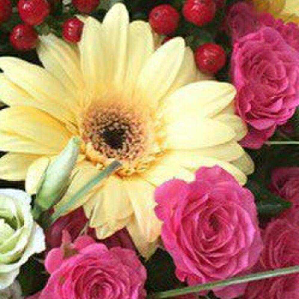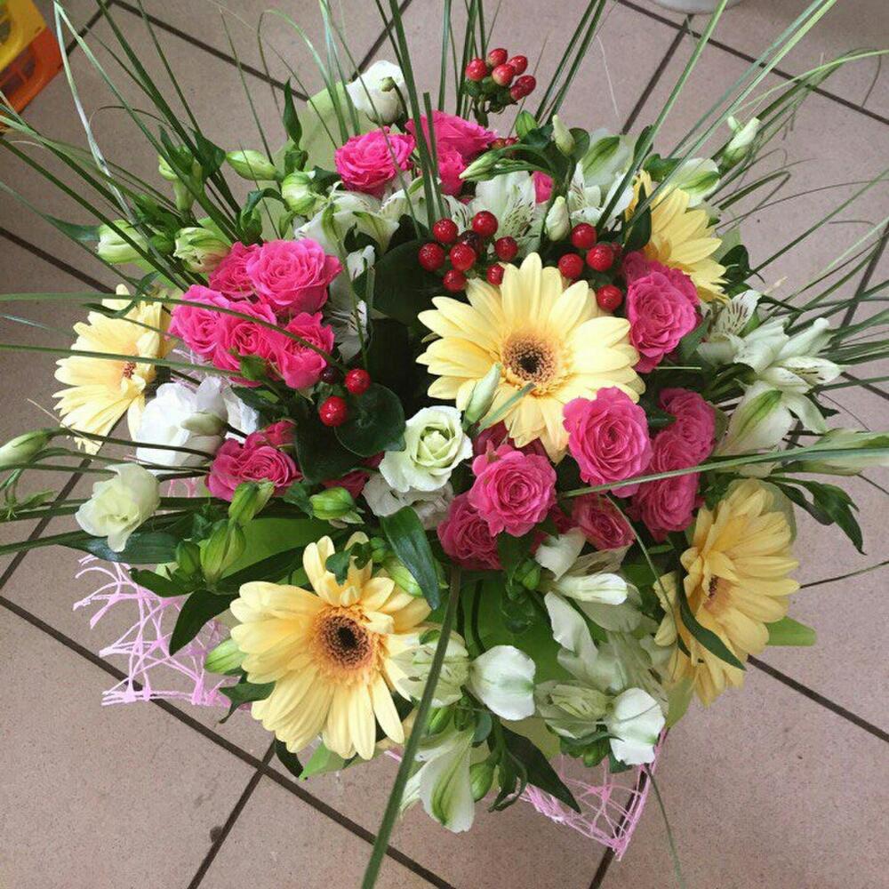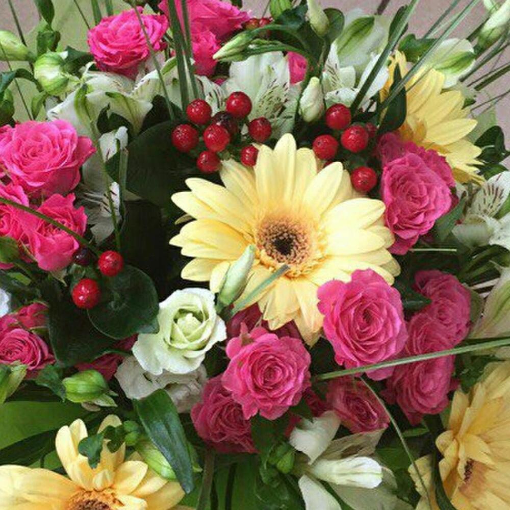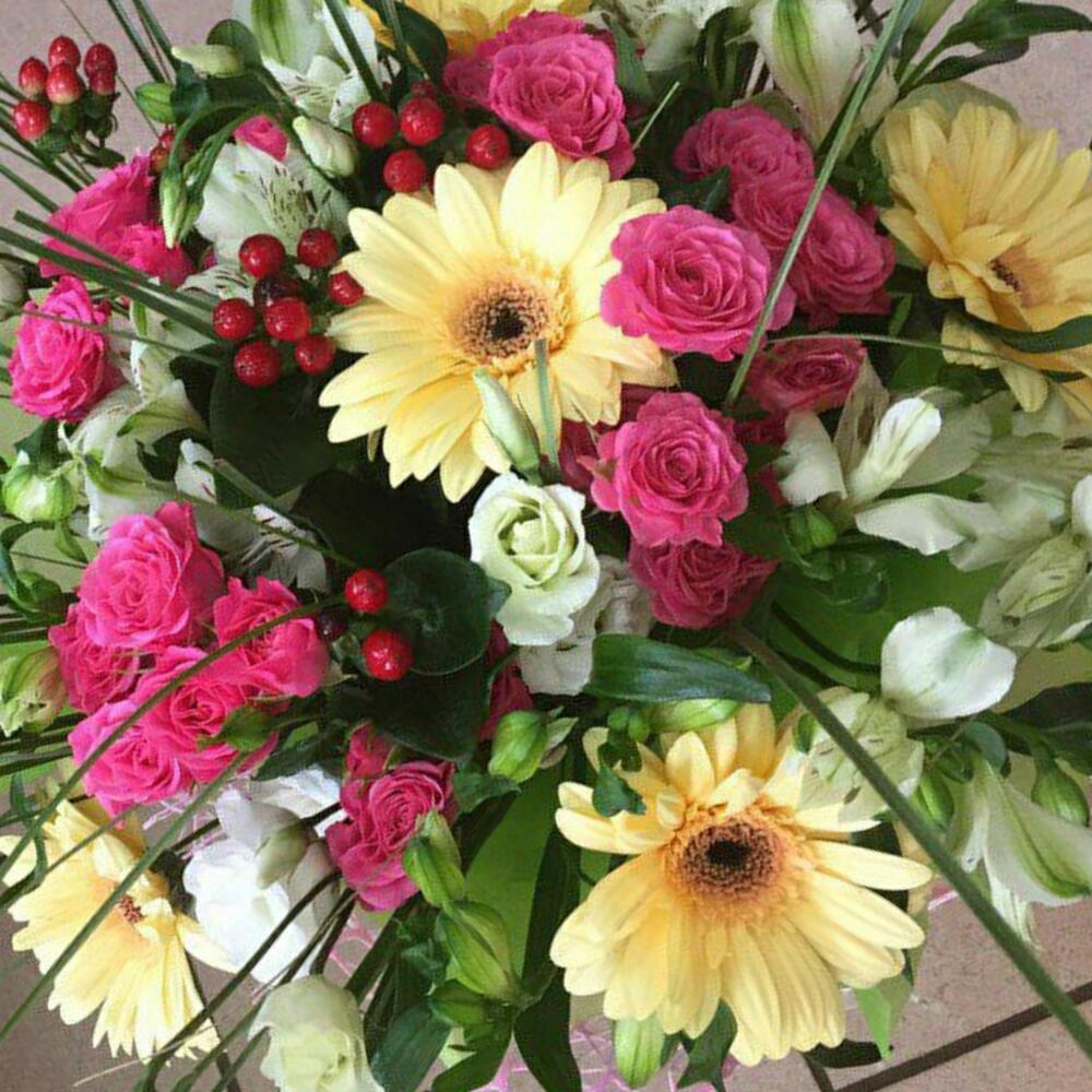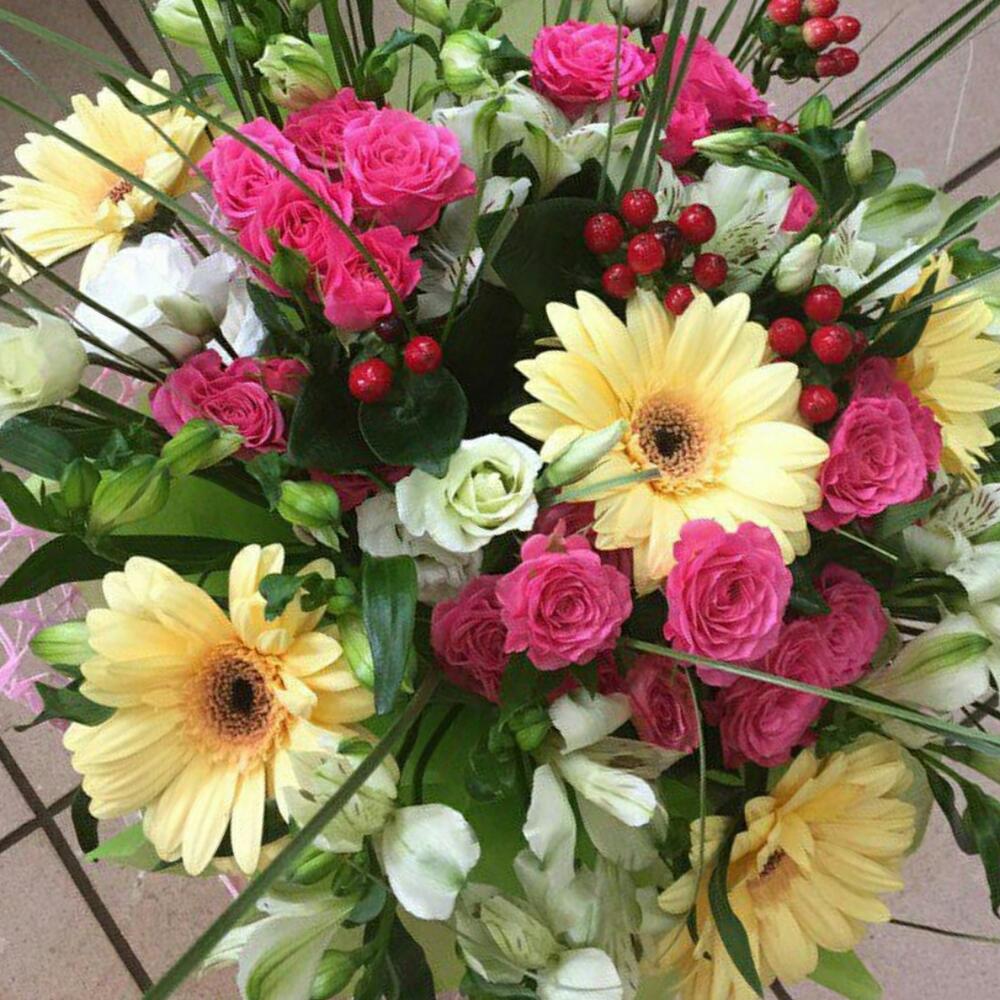 Hypericum - 4 pcs Bergrass - 3 pcs Rose bush pink - 4 pcs Lisianthus white - 3 pcs Cream gerbera - 5 pcs альстромериямикс европа - 4 pcs