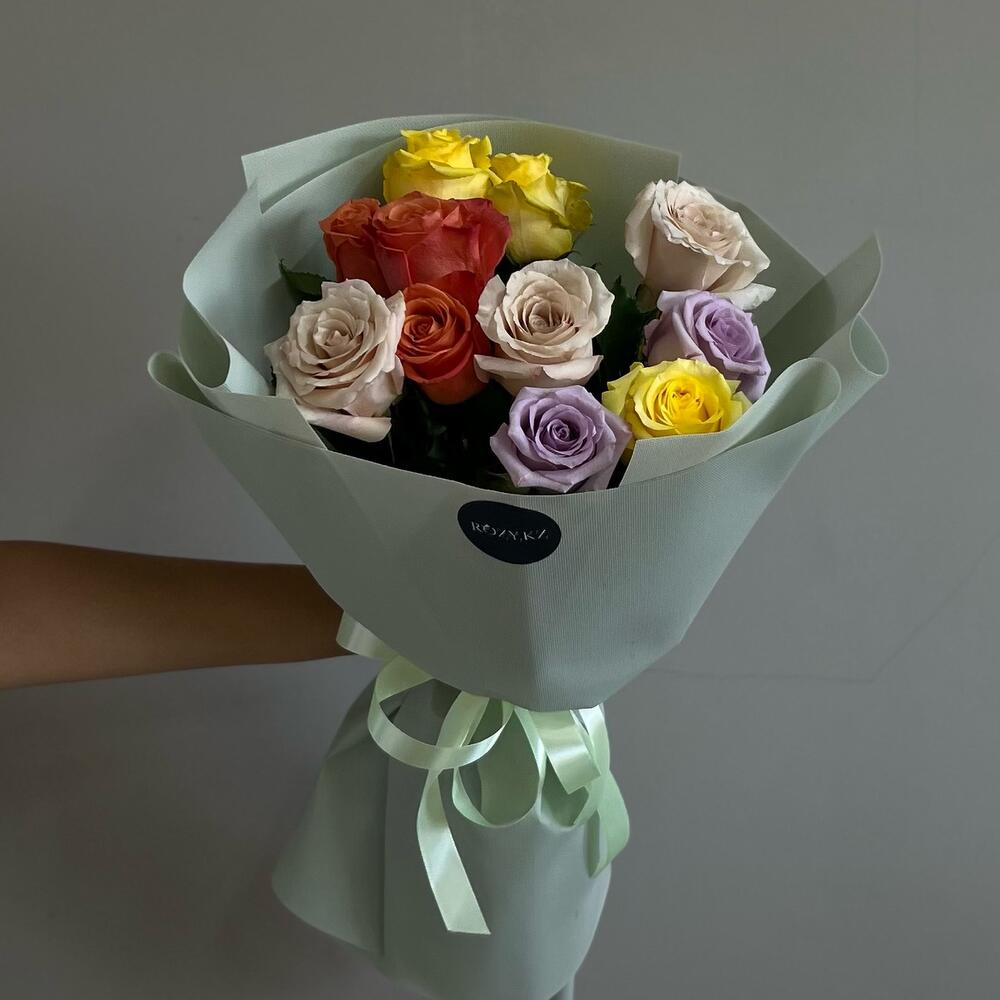 3 бежевых розы 3 оранжевые розы 2 фиолетовые розы 3 желтые розы