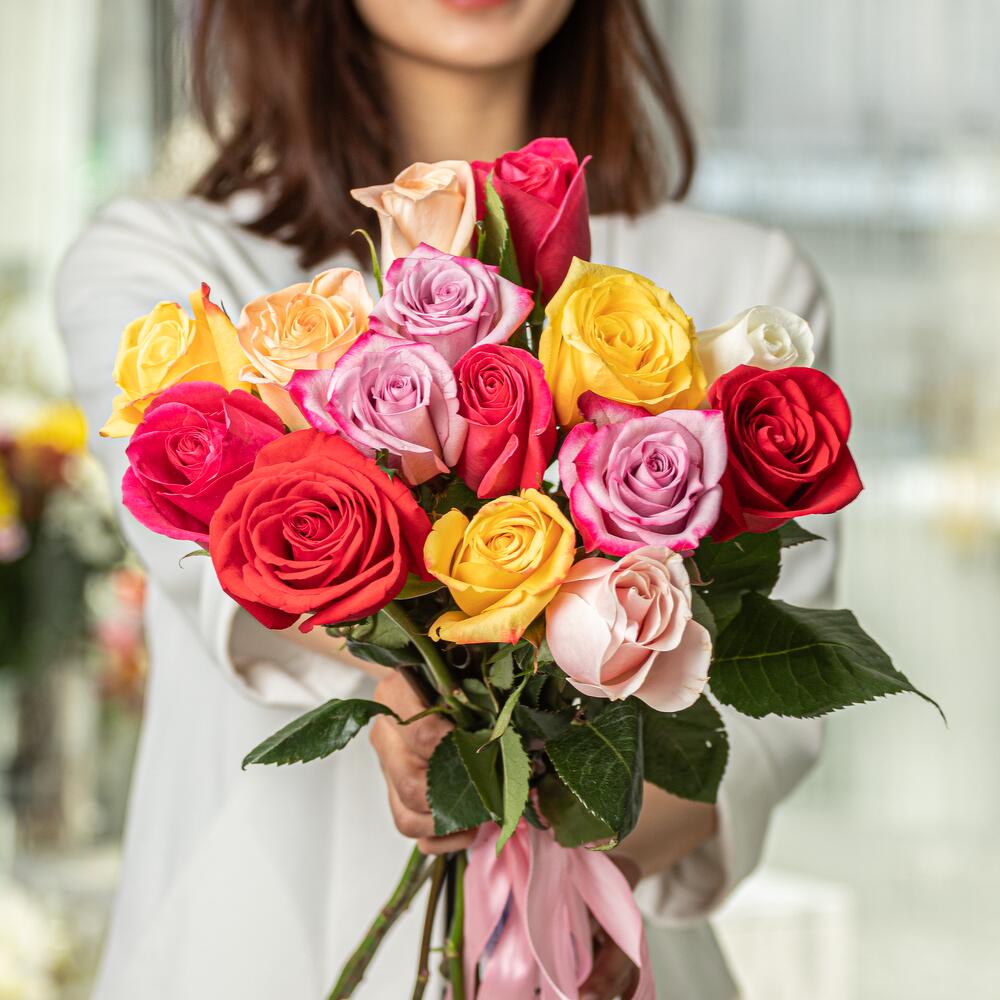 Bouquet of 15 mixed Dutch roses 50 cm. A rich and bright bouquet of elite varieties of roses brought from Holland. It will give you an extraordinary feeling, a positive mood and a firework of emotions. Order a bouquet of colorful roses from Henry Bonnar with worldwide delivery, give amazing emotions to your loved ones, relatives and loved ones.