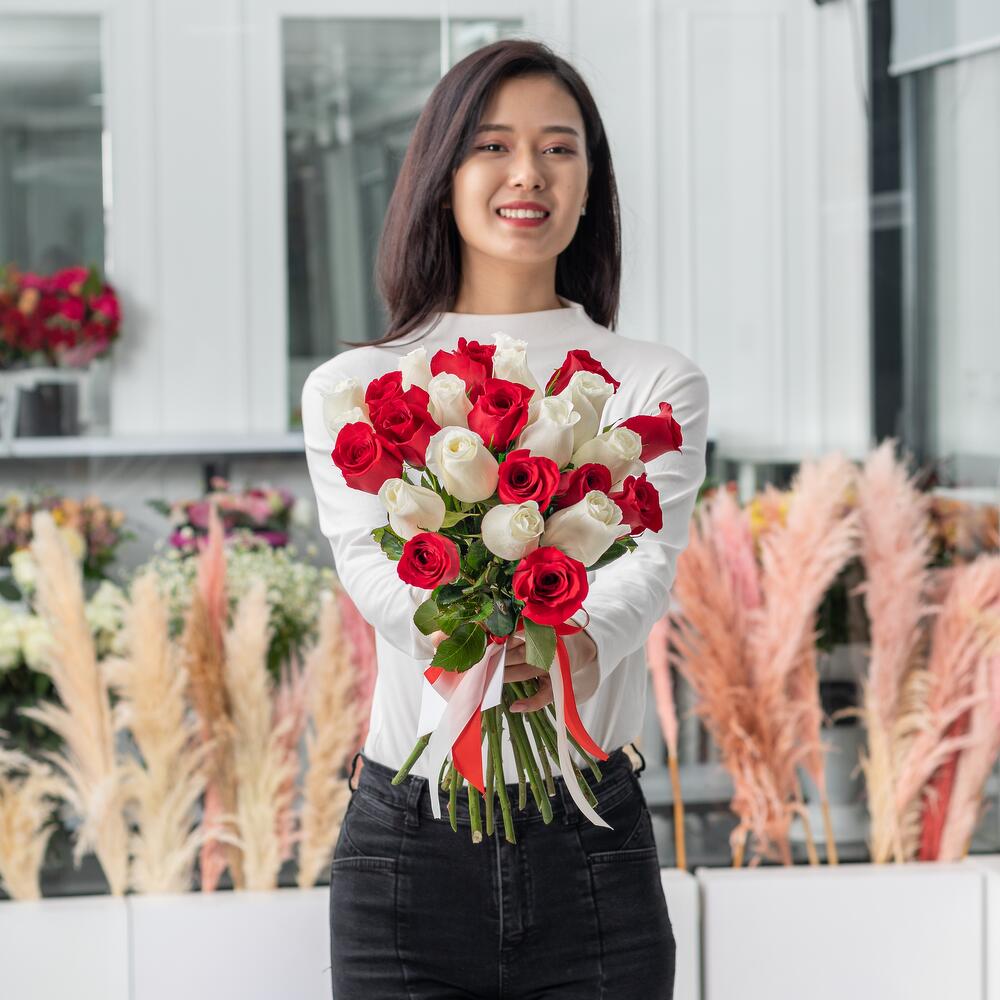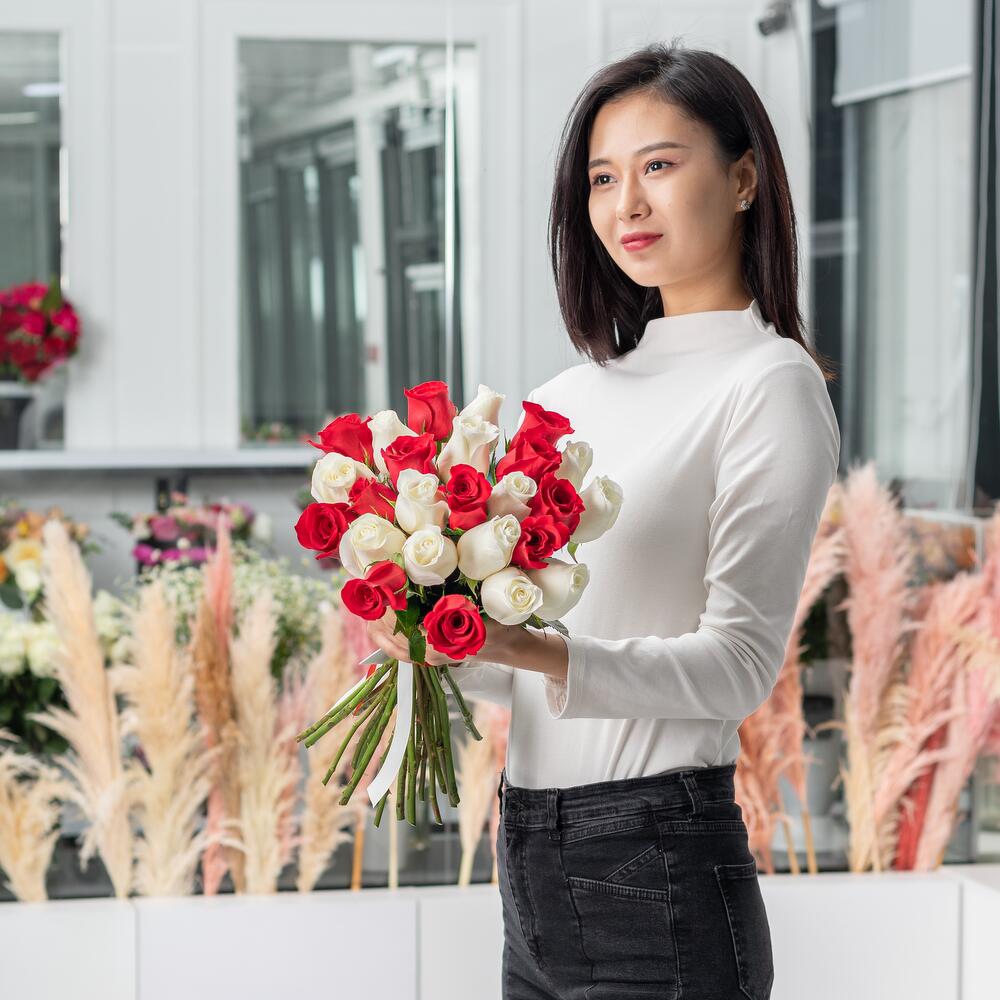 Bouquet of 25 red and white Dutch roses 50 cm. The red and white rose combines a symbol of love, passion, tenderness and grace. A beautiful bouquet that can be given for any celebration or for no reason when you want to pay attention to a loved one. Choose a bouquet of roses from Henry Bonnar with worldwide delivery, give pleasure and express compliments to your family.