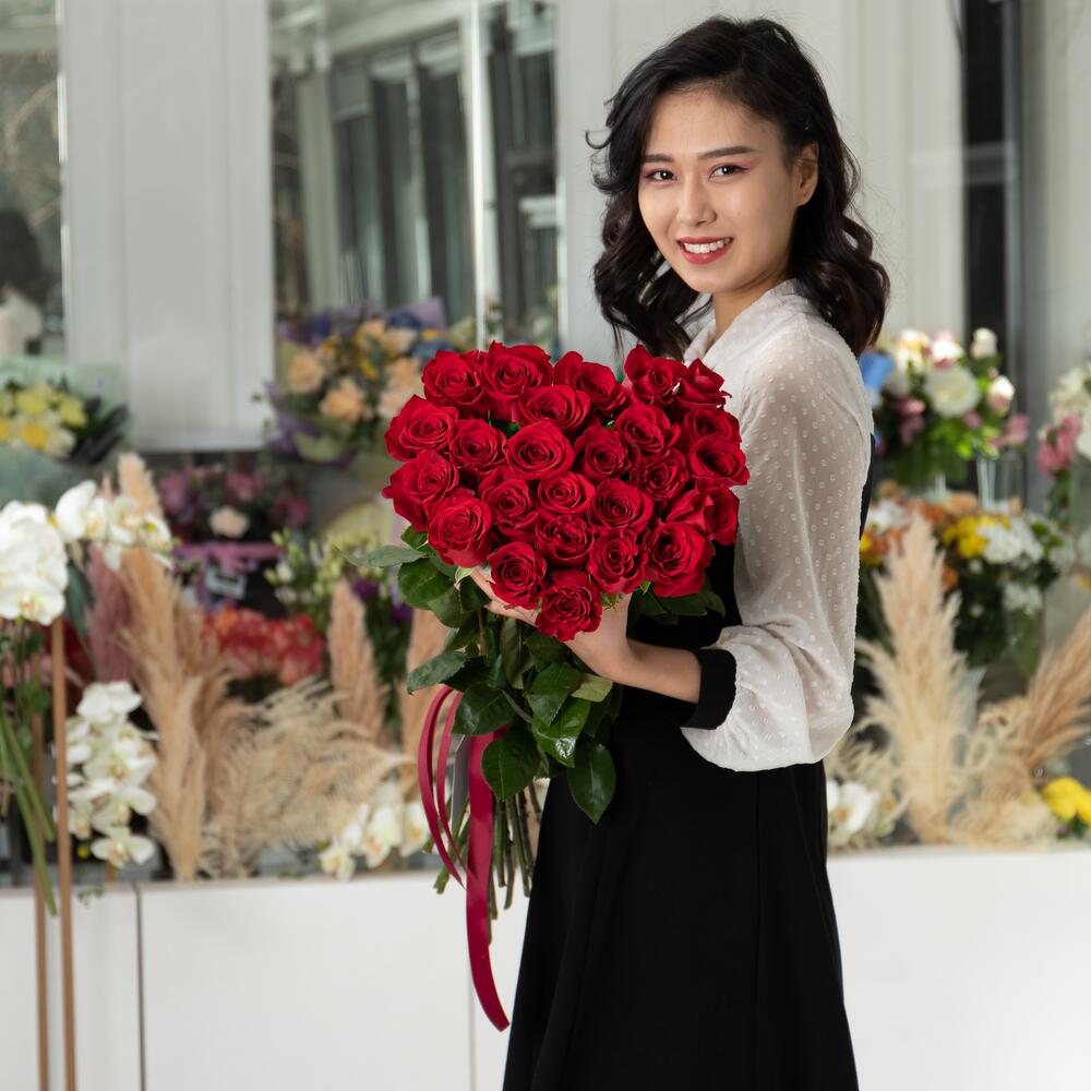 Bouquet of 25 red Dutch roses 80 cm high. In our store you can choose a bouquet for every taste and the cost of flowers.