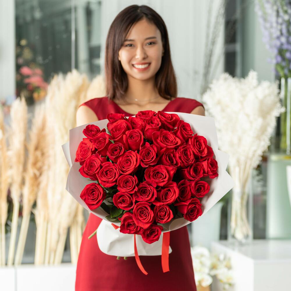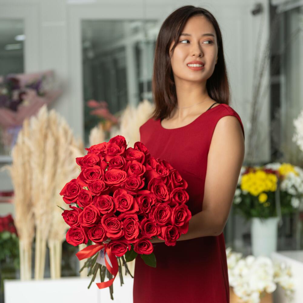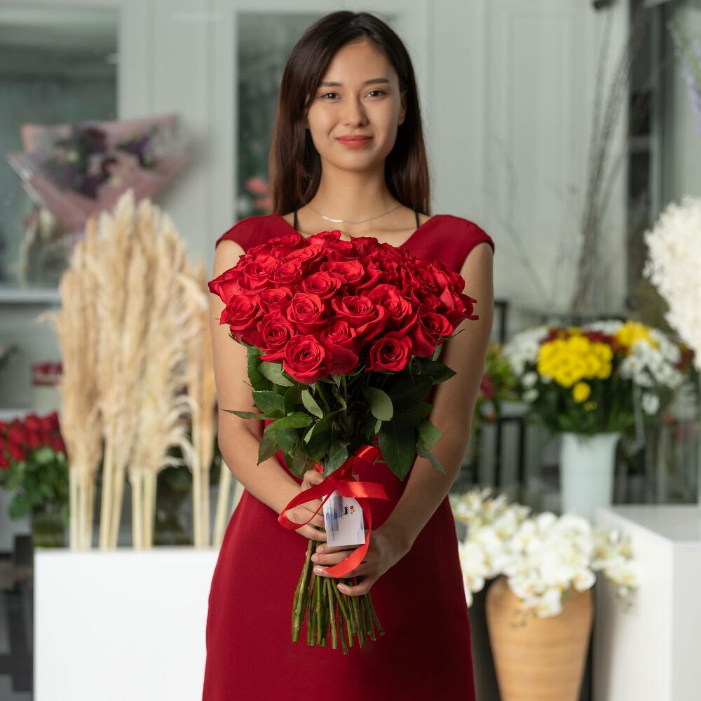 Bouquet of 35 red Dutch roses, 50 cm. Red roses will never go out of fashion, the perfect gift to declare your love. Or, such a bouquet can be given as a compliment, to congratulate someone on a special date. Choose rose bouquets with worldwide delivery, give pleasant moments to your loved ones. Our florists can create a beautiful and stylish bouquet arrangement. *Please, when ordering, indicate which arrangement you prefer, with ribbon or with aqua paper.