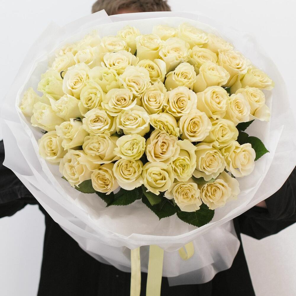 Изысканный монобукет из 51 белоснежной розы — воплощение чистоты, нежности и вечной элегантности. Каждый бутон, словно облако, сливается в пышную композицию, символизирующую искренность, новые начала и благородную любовь.