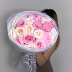 Satin ribbon - 1 pcs Designer packaging - 3 pcs Crisal (top dressing) - 1 pcs Pink O'Hara roses - 12 pcs white o’hara roses - 13 pcs