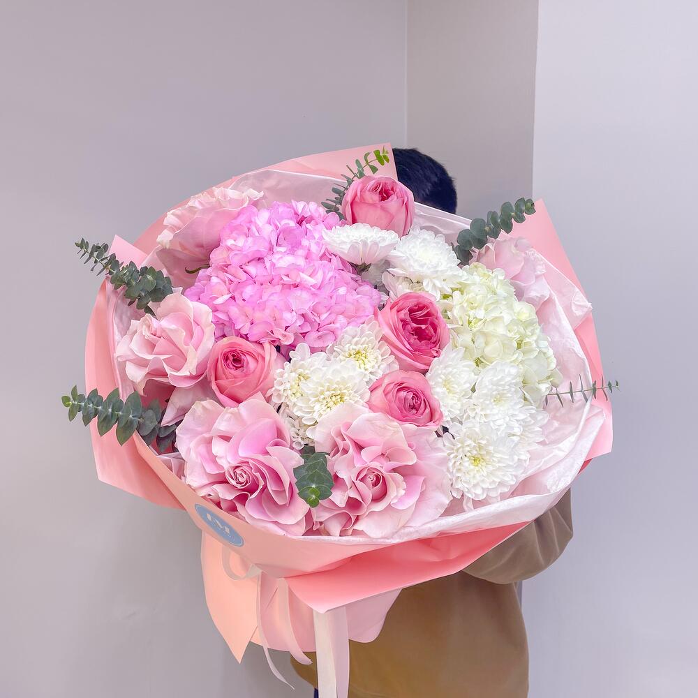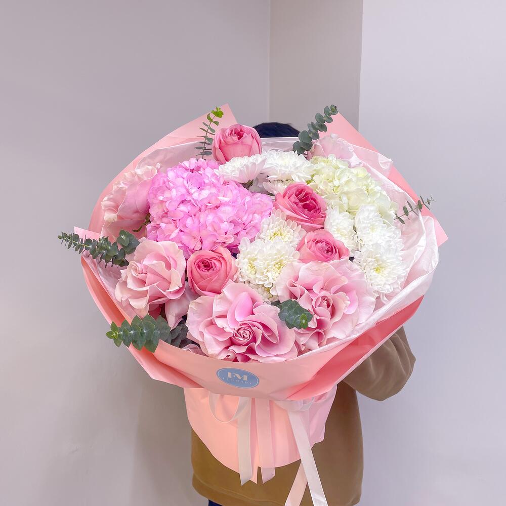 Hydrangea - 2 pcs Eucalyptus - 1 pcs chrysanthemums - 3 pcs dutch roses - 5 pcs peony - shaped roses - 4 pcs
