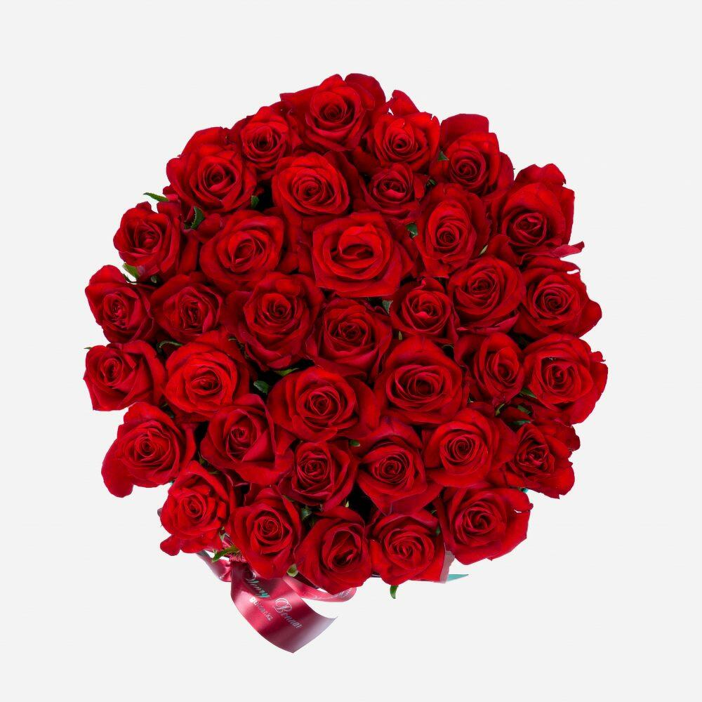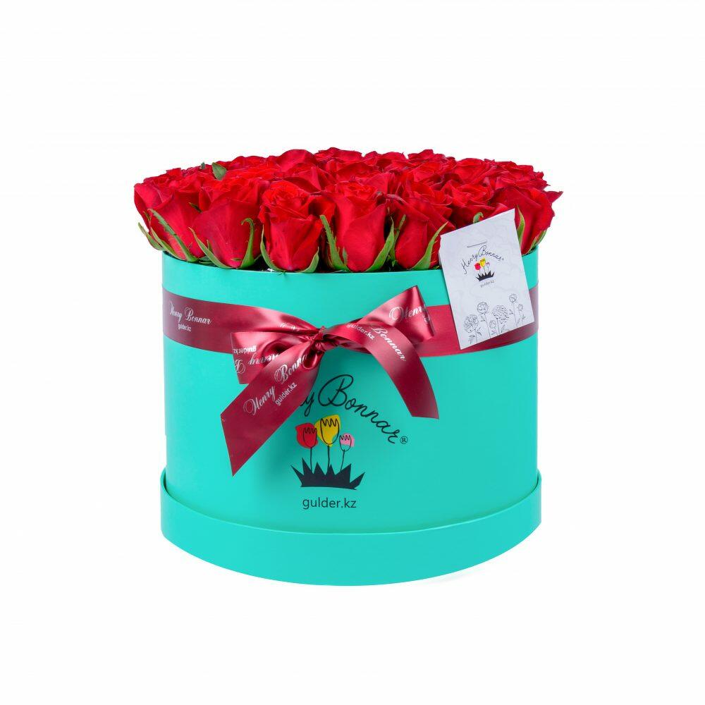 Букет из красных роз в коробке тиффани "Glamour"S состоит из 35 шт. Букет из красных роз в коробке тиффани "Glamour", подходящий подарок по любому случаю, когда кого-то просто хочешь порадовать, приятно удивить или поздравить. Прекрасные розы в коробке, не только сохранят свою свежесть, аромат и благоухание надолго, а также останутся в памяти и будут радовать своим видом очень долгое время.