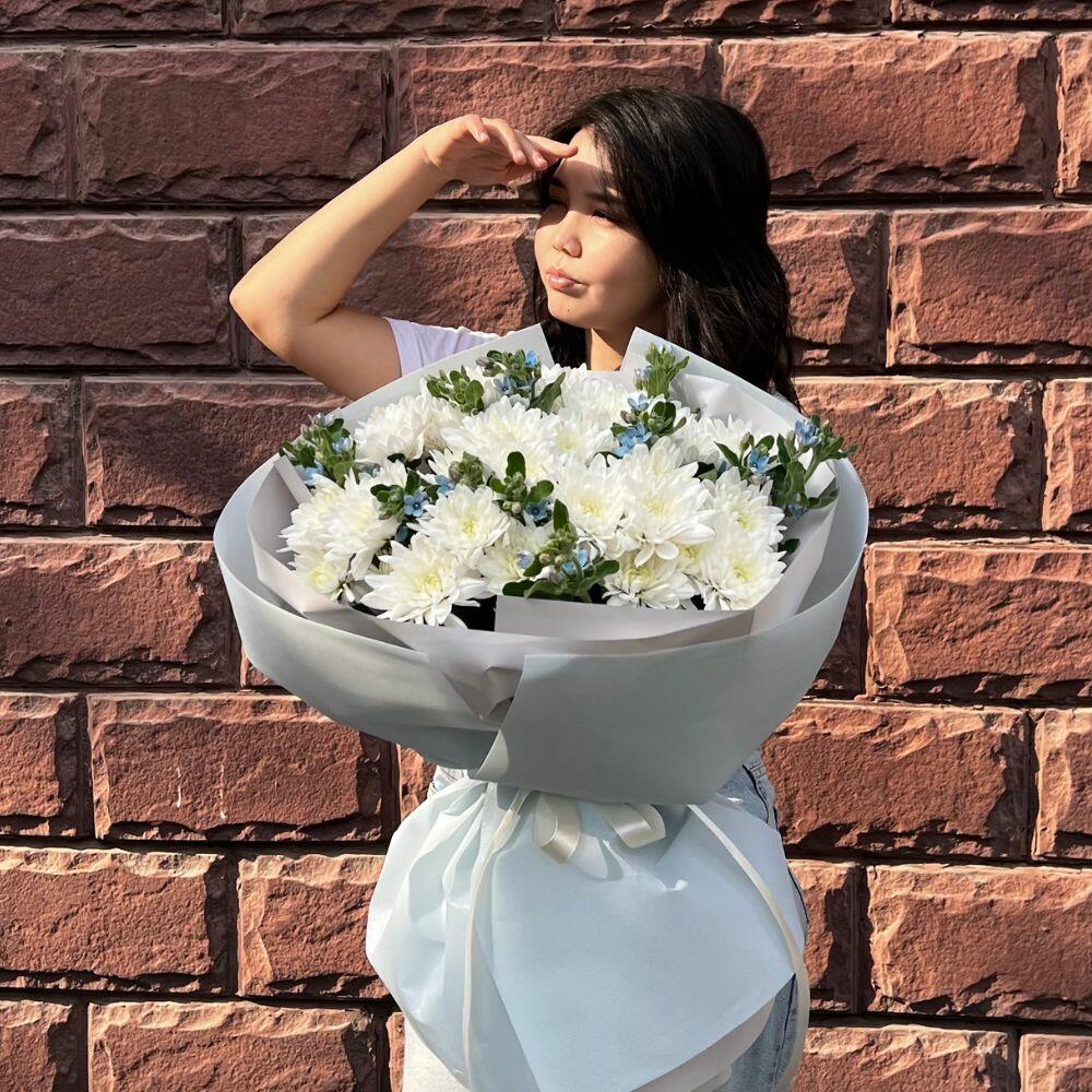 Лёгкий, воздушный и невероятно нежный — букет из кустовых хризантем и твидий от Оранж Алматы станет идеальным подарком для любого повода. Белоснежные хризантемы символизируют чистоту и доброту, а изящные голубые твидии придают композиции особое очарование и свежесть. Такой букет наполняет пространство светом и гармонией, создавая атмосферу уюта и радости.