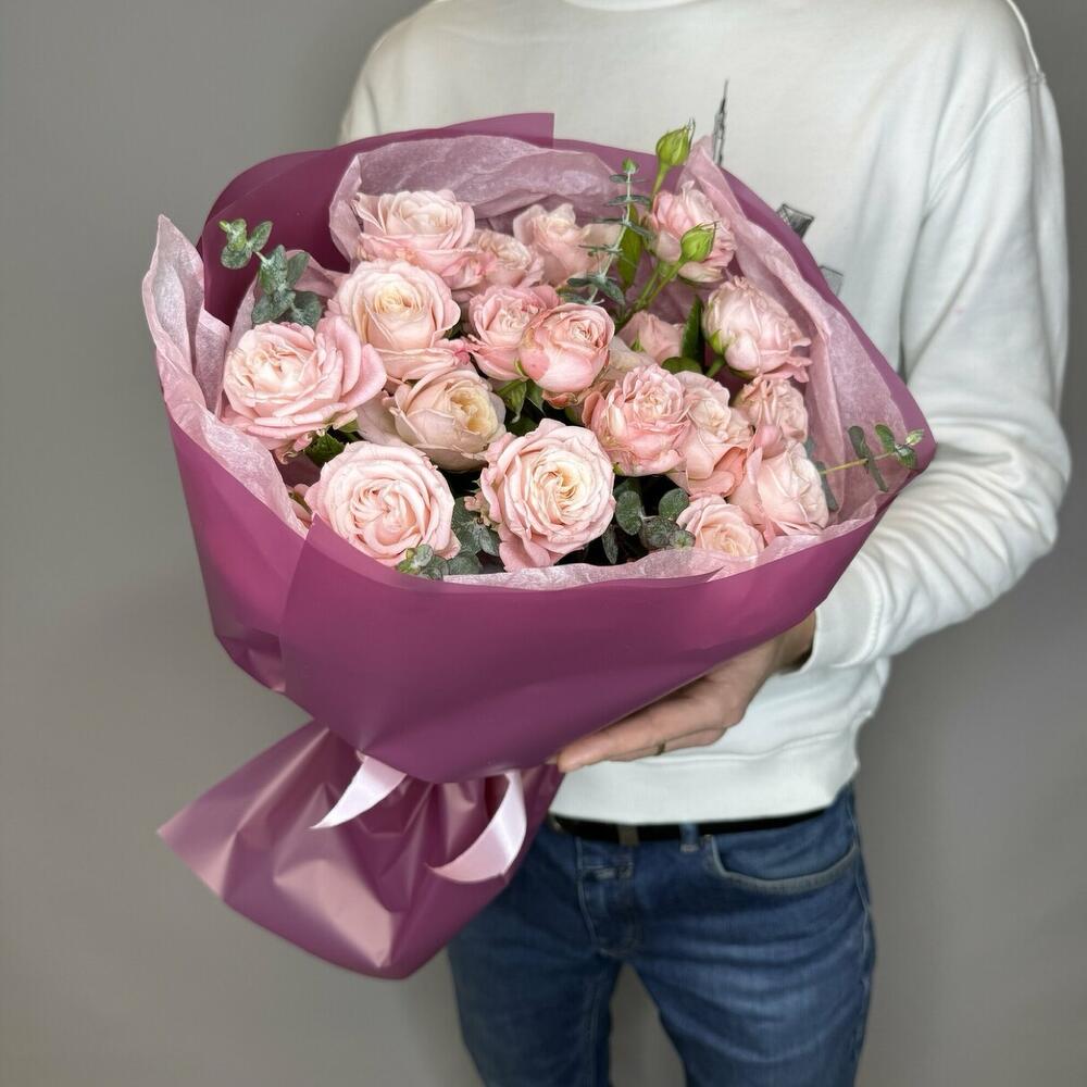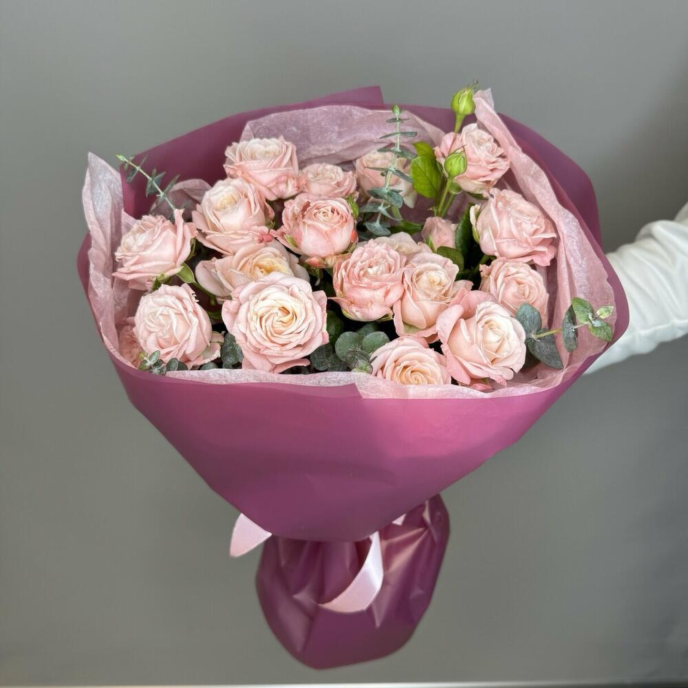 Нежный и романтичный букет из кустовых пионовидных роз, словно объятый свежим зеленым эвкалиптом. Это идеальный подарок для особенного человека, который подчеркнет ваши искренние чувства. Аромат цветов наполняет воздух гармонией, а их уникальный облик несомненно вызовет восторг у получателя. Окунитесь в мир природной красоты с этим элегантным и незабываемым букетом.