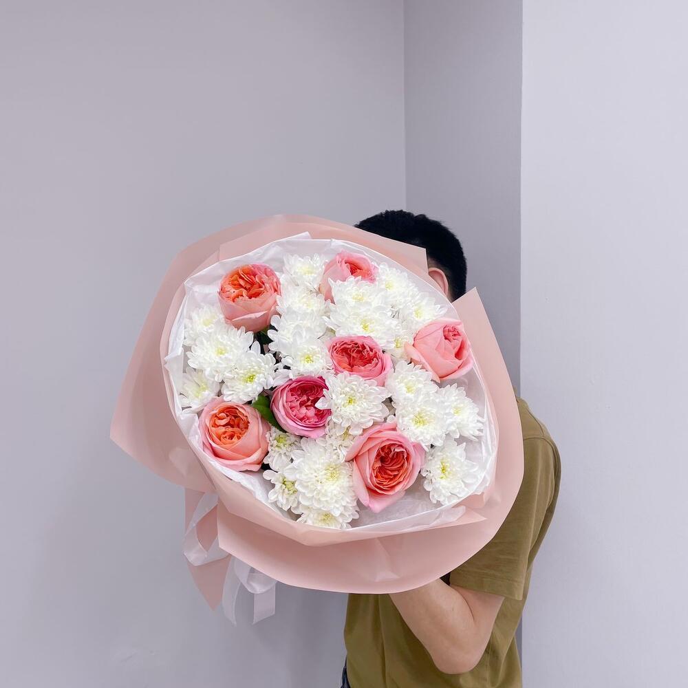 Букет из пионовидных роз и голландских хризантем