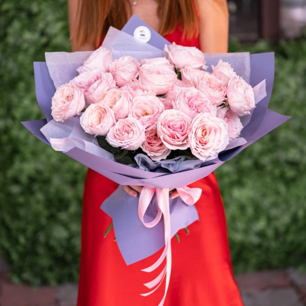 The peony-style rose bouquet "Darina"S consists of 15 peony-style roses. The "Darina" bouquet is made from David Austin peony-style roses of the Tsumugi variety; choosing to give this delightful bouquet will be a fail-safe option. The exotic flowers included can awaken warm feelings and the most positive emotions. Delight your loved ones with beautiful, top-quality bouquets from H.Bonnar. *peony-style roses may be replaced with another David Austin variety similar in color palette