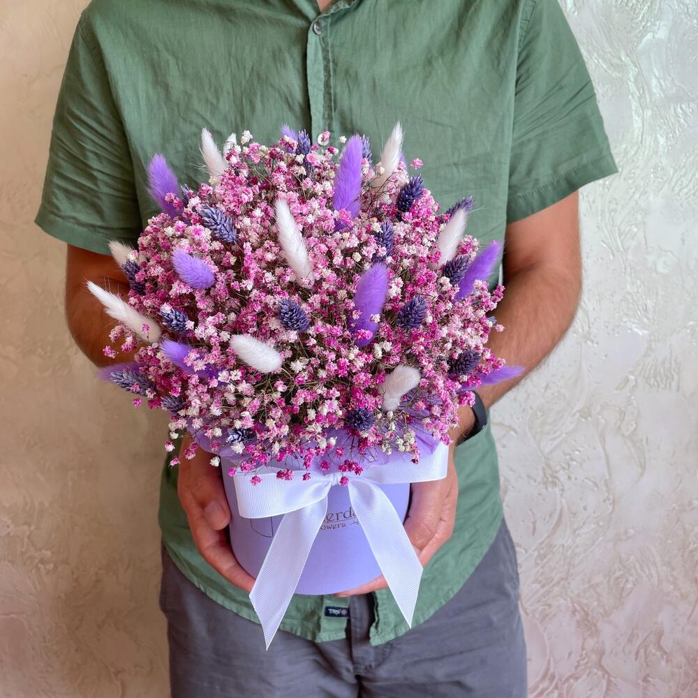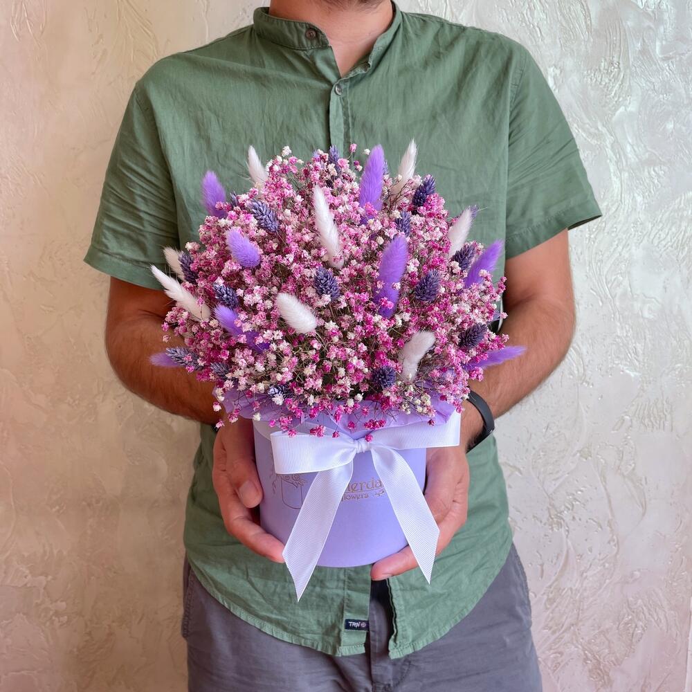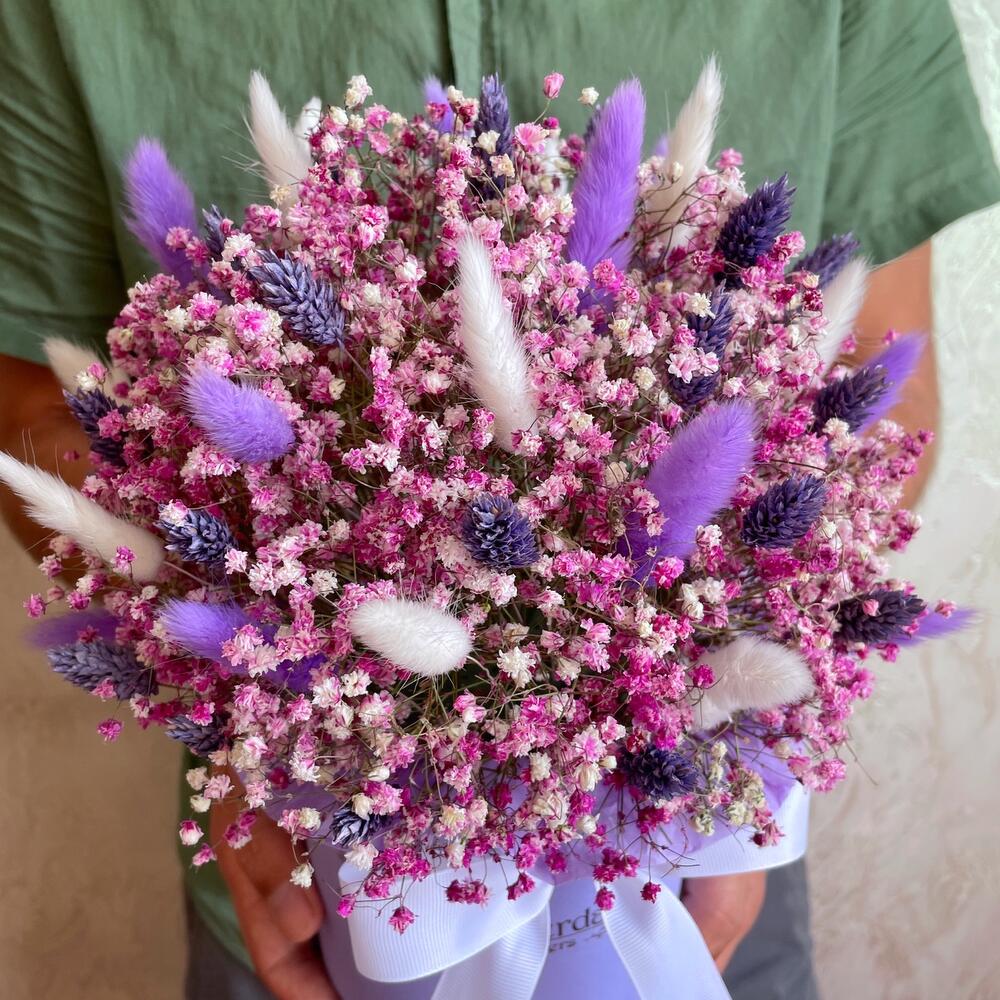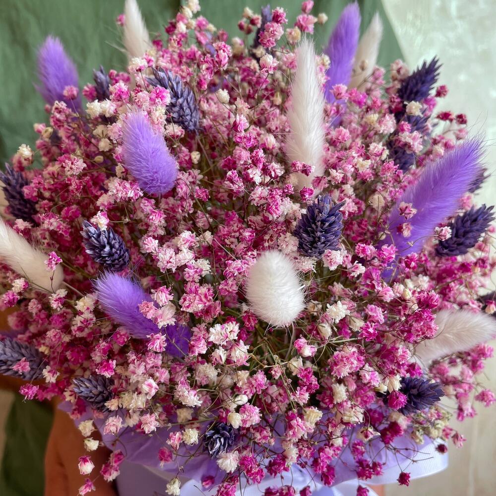 Oasis - 1 pcs Lagurus (dried flower) - 30 pcs Box d15 - 1 pcs gypsophila (dried flowers) - 9 pcs phalaris (dried flower) - 20 pcs