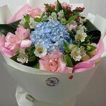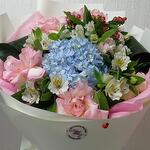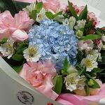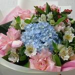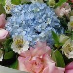 Hypericum - 1 pcs Blue hydrangea - 1 pcs роза эсперанса развернутая - 3 pcs альстромерия розовая - 3 pcs