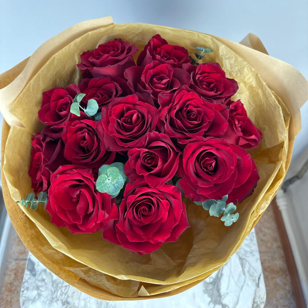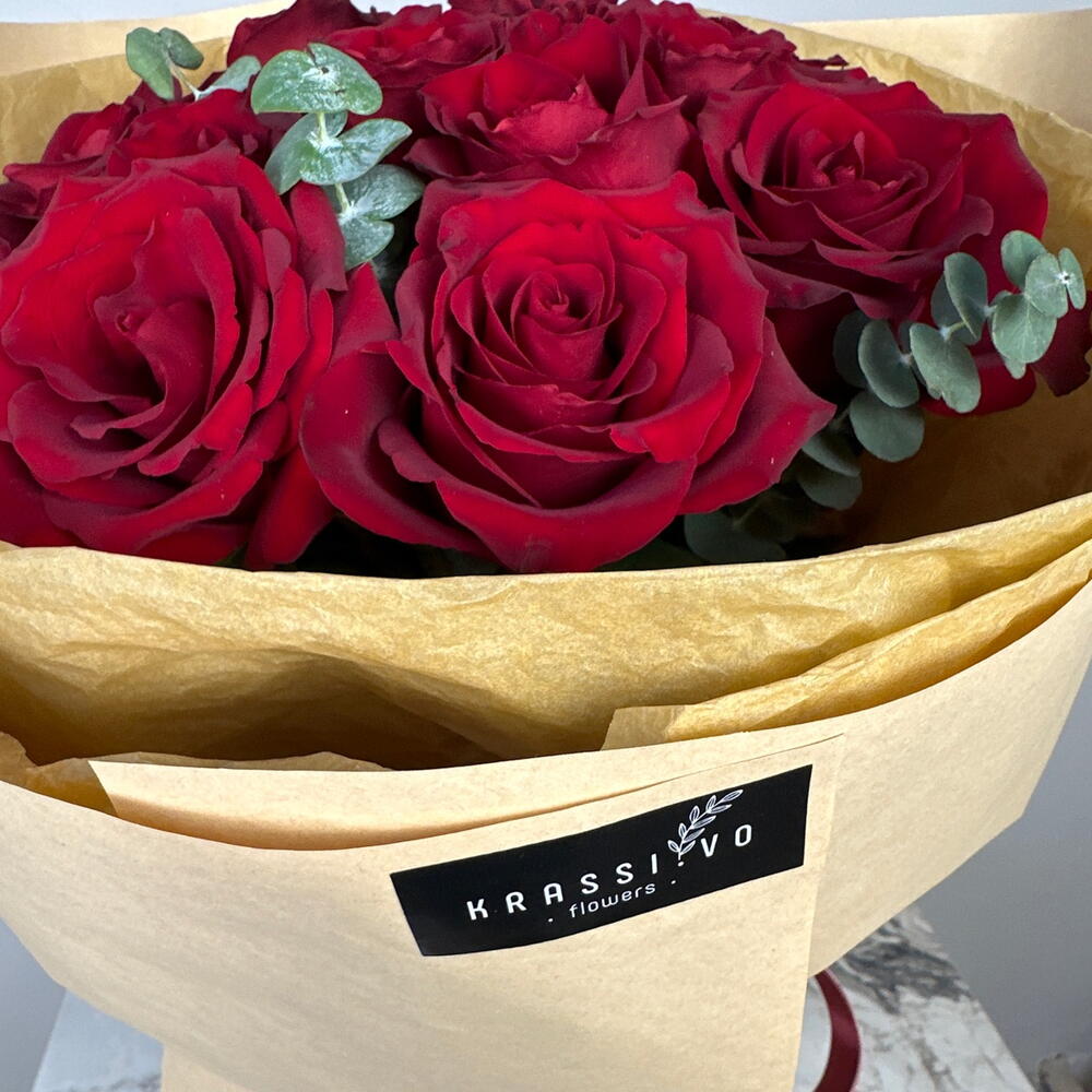 Satin ribbon - 2 pcs Wrapping Kraft and tissue - 8 pcs roses explorer ecuador - 15 pcs эвкалипт бебби - 5 pcs
