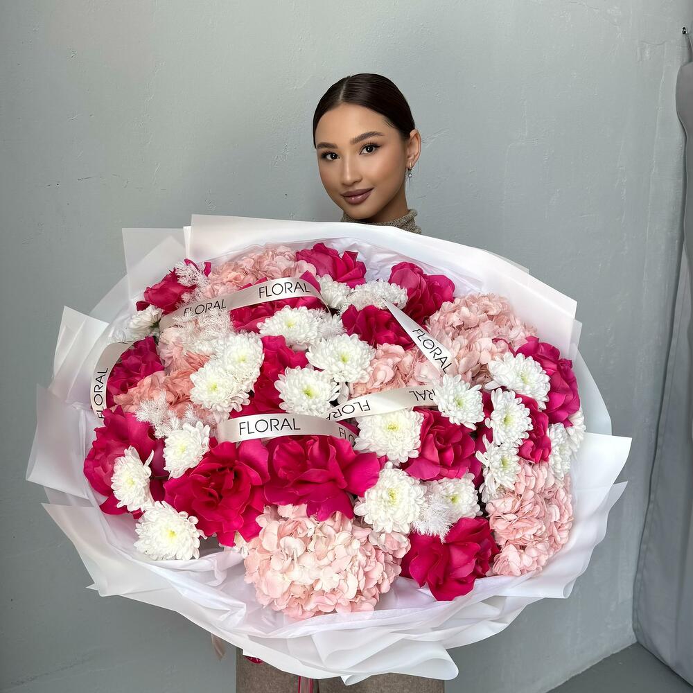 Hydrangea - 7 pcs Rose - 13 pcs Chrysanthemum - 8 pcs Dried flowers - 3 pcs