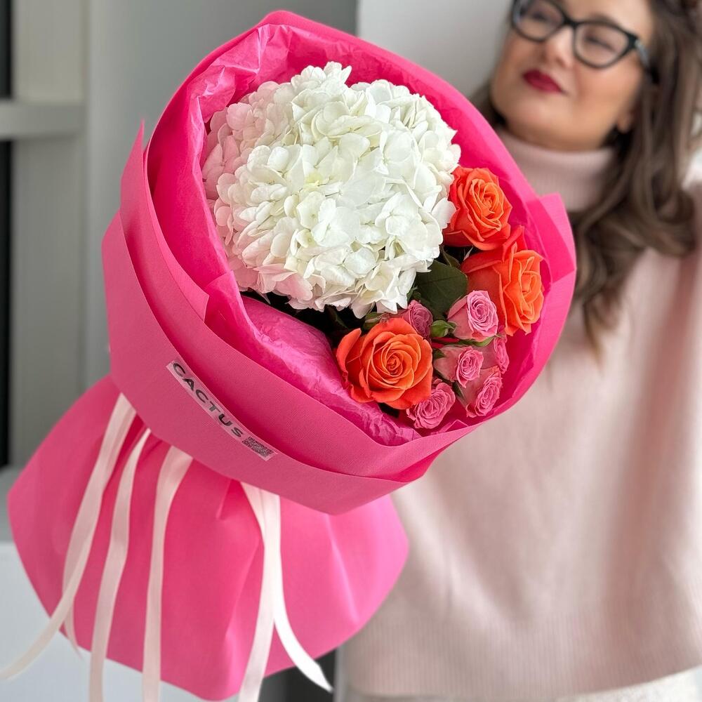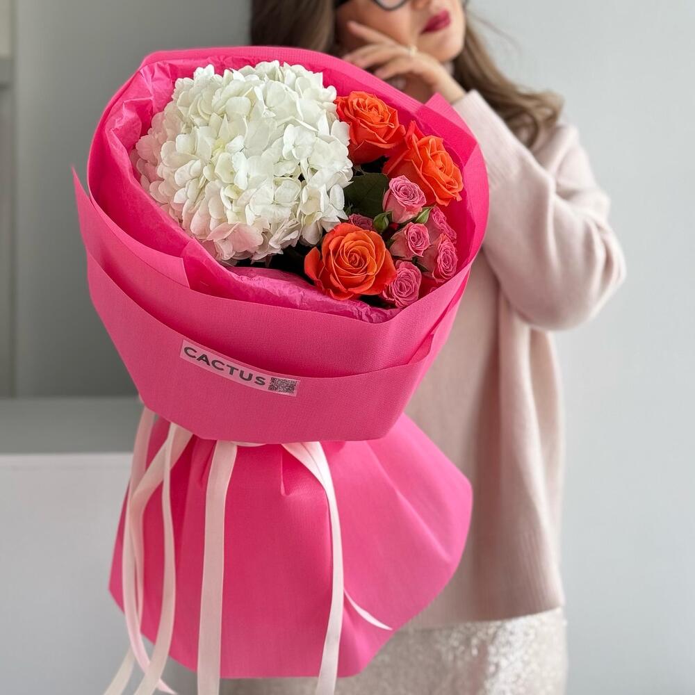 Hydrangea - 1 pcs Bush rose - 1 pcs Peony-like rose - 3 pcs Designer packaging - 1 pcs