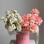 Комбинация из белых эустом и ярких роз с розовой окантовкой в стильной цилиндрической коробке Royal flowers
