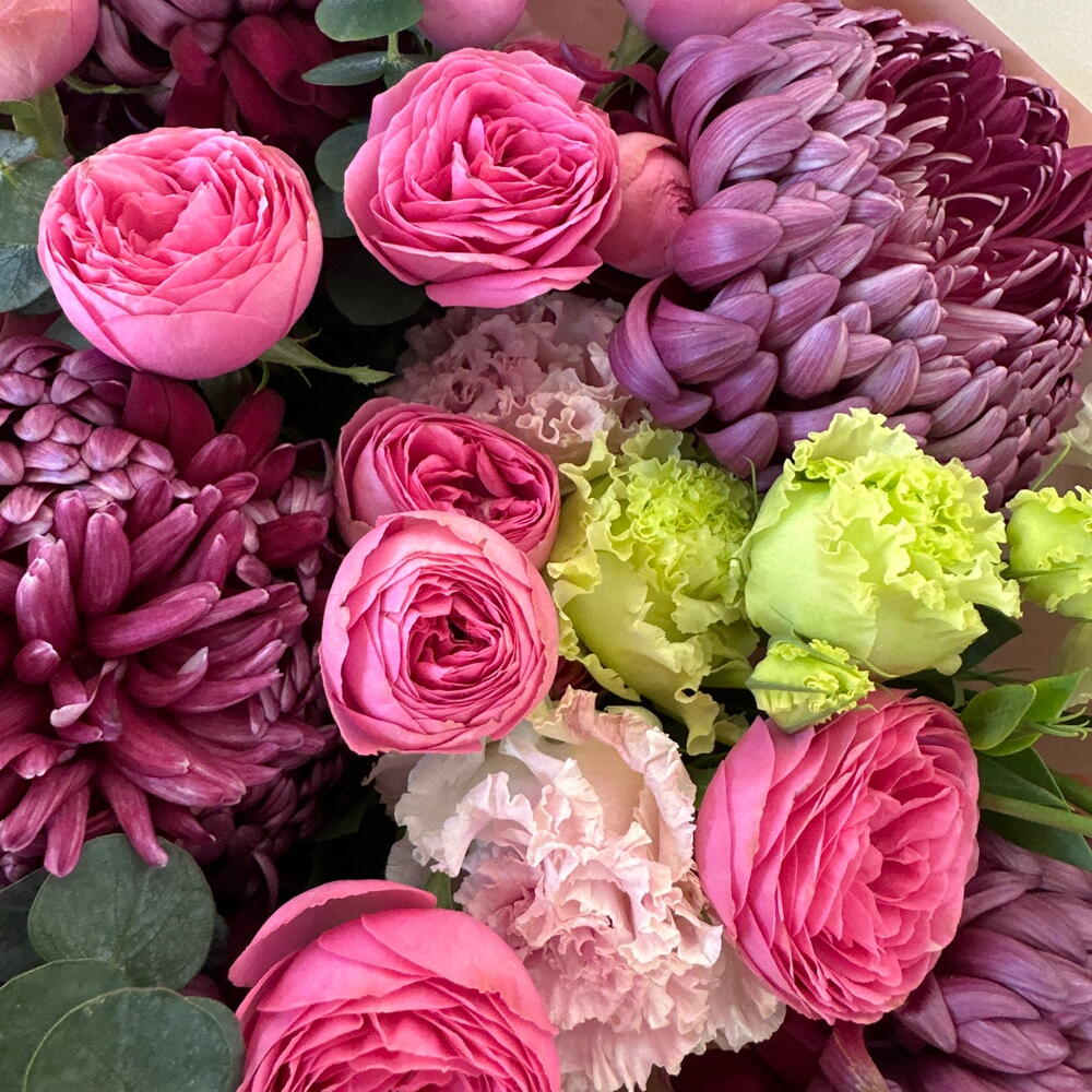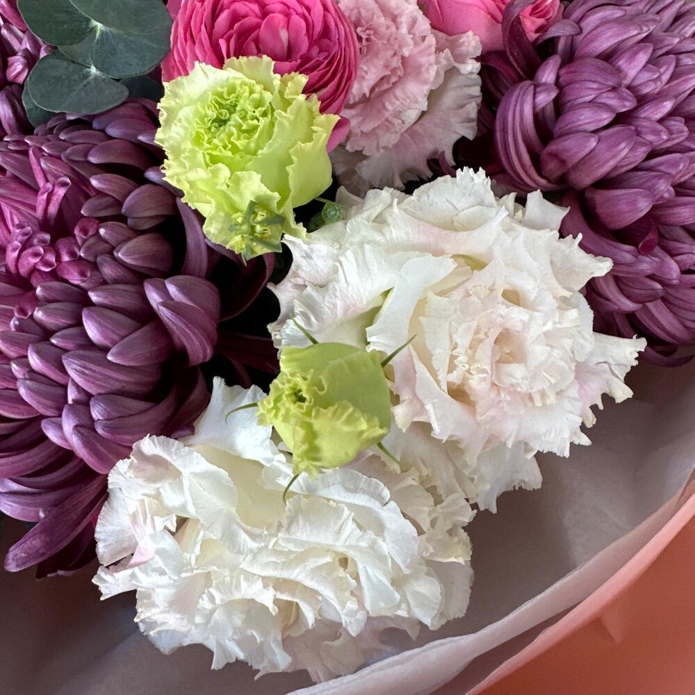 Eustoma - 4 pcs Satin ribbon - 1 pcs chrysanthemum disbudded curler - 7 pcs packing tissue and tape - 8 pcs эвкалипт бебби - 5 pcs спрей роза жизель пионовидная - 4 pcs