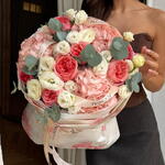 Hydrangea - 3 pcs Lisianthus - 6 pcs Eucalyptus - 1 pcs peony - shaped roses - 7 pcs