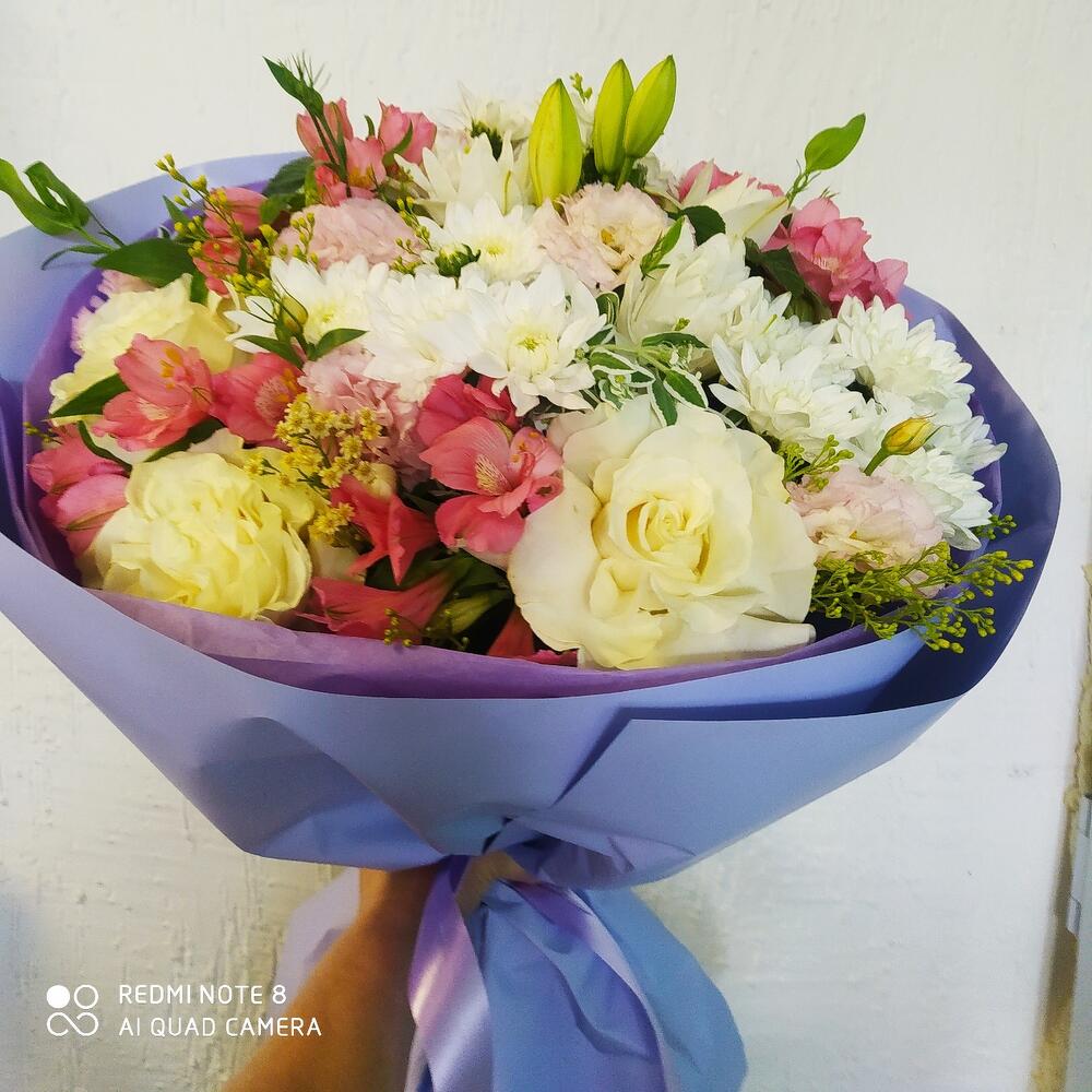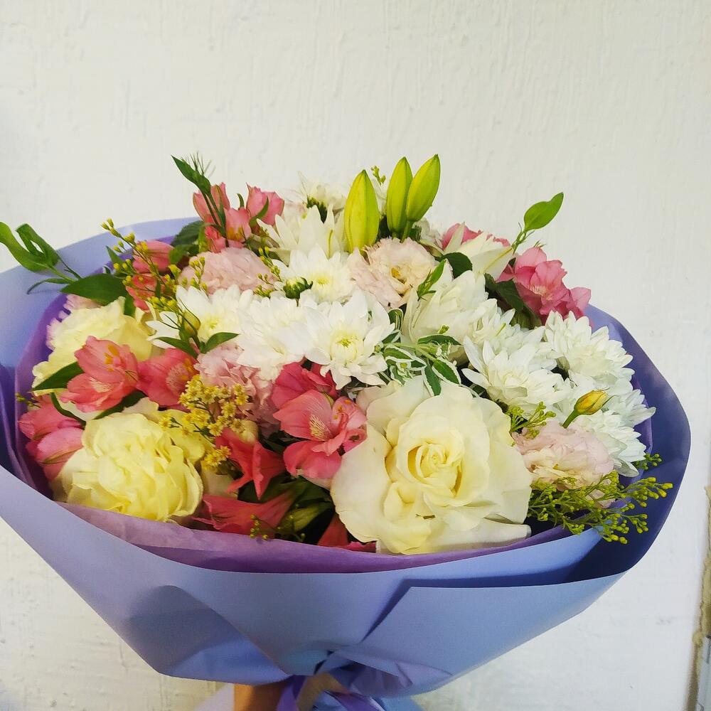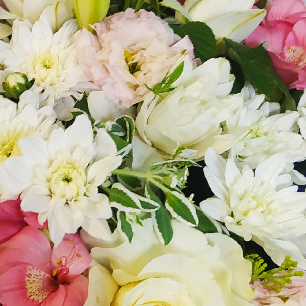 Bush rose - 3 pcs Chrysanthemum bush - 3 pcs Lisianthus Alisa white - 4 pcs White rose 50 cm - 3 pcs альстромериямикс европа - 5 pcs