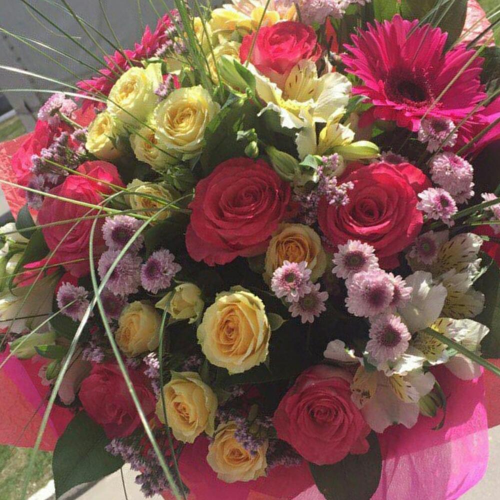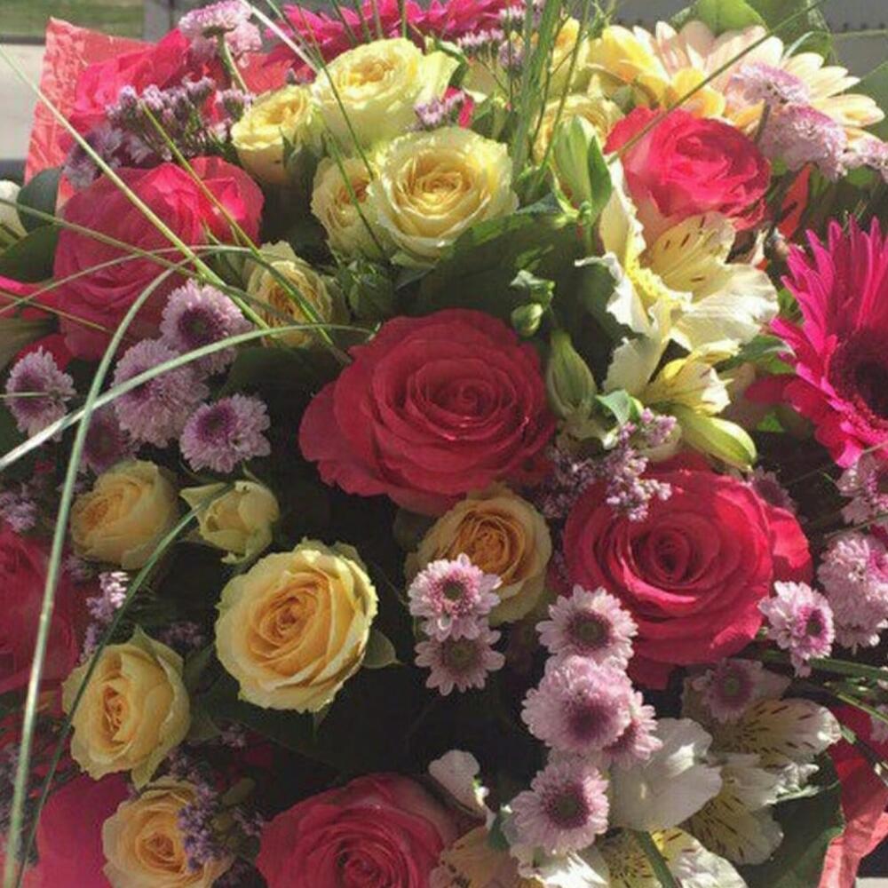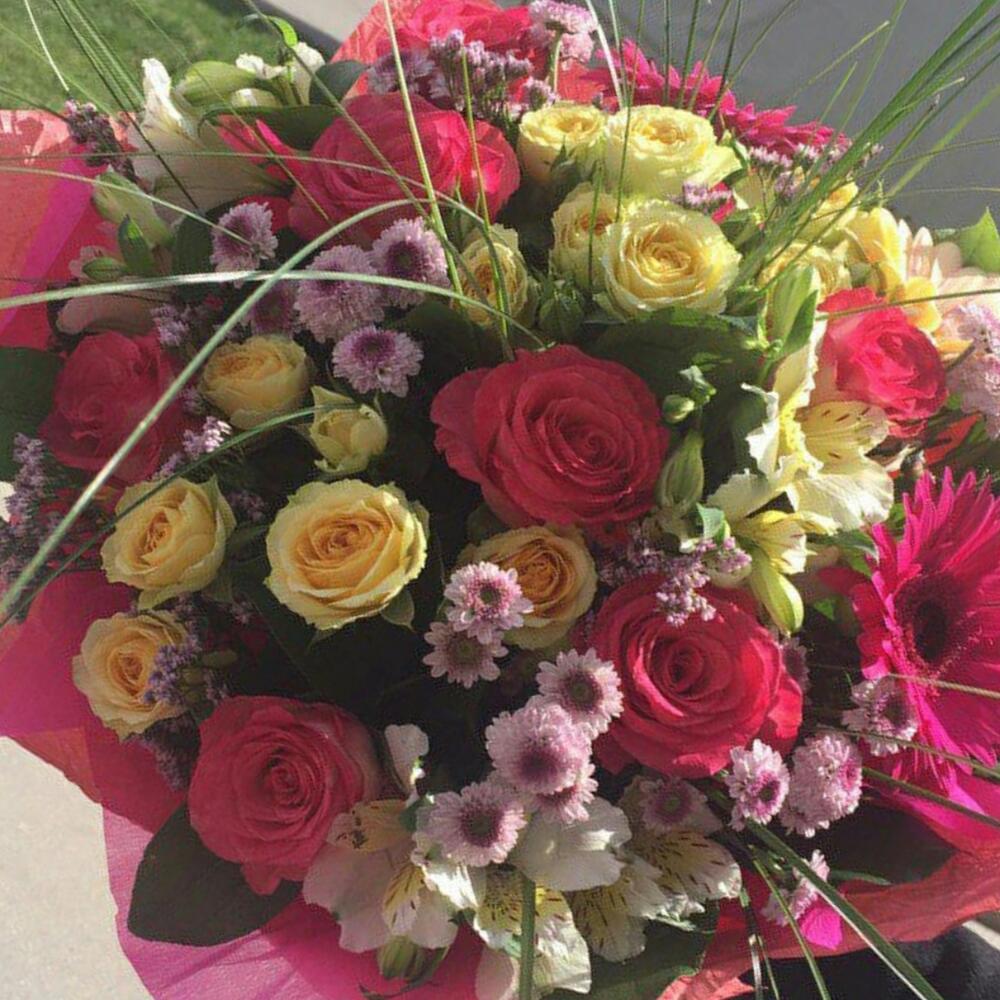 Chrysanthemum bush - 5 pcs Ecuador Rose - 5 pcs Rose bush cream - 5 pcs гербера малиновая большая - 5 pcs альстромериямикс европа - 5 pcs