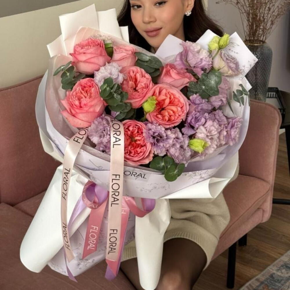 Lisianthus - 5 pcs Eucalyptus - 1 pcs peony - shaped roses - 7 pcs