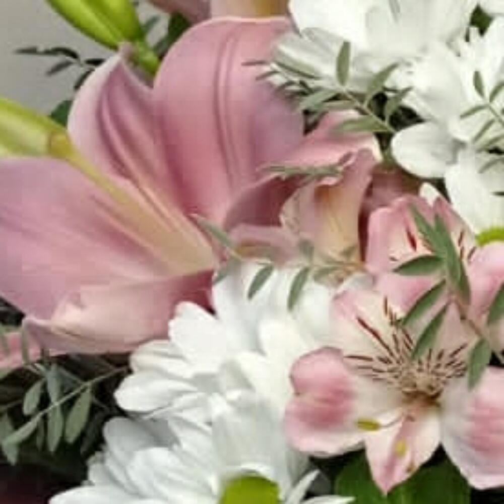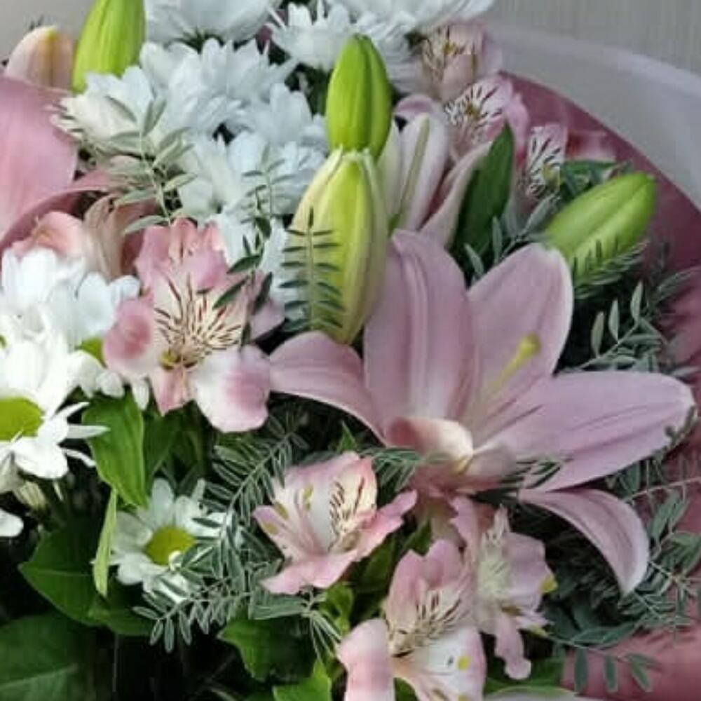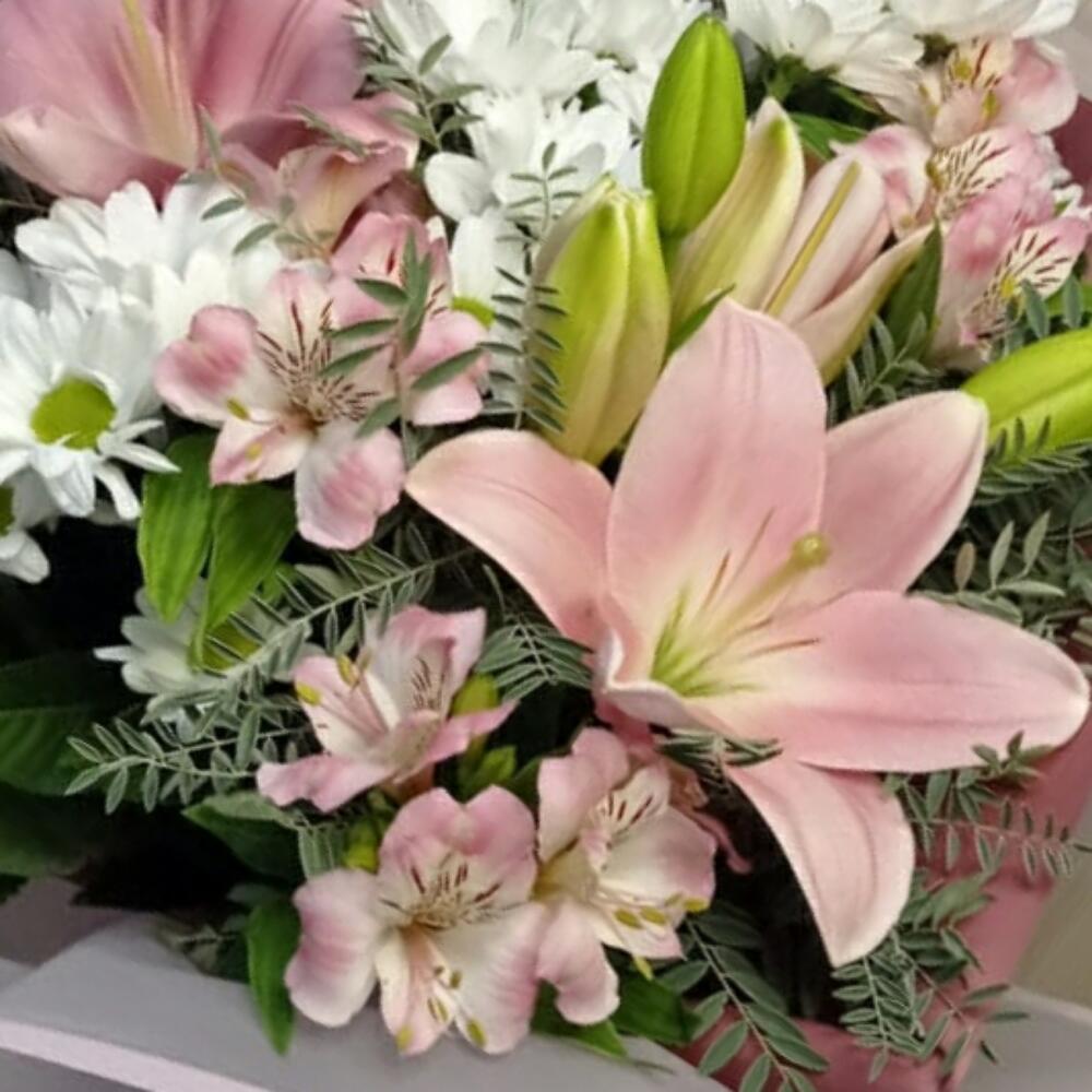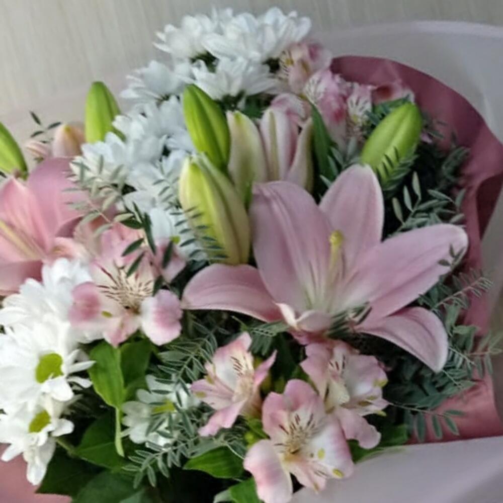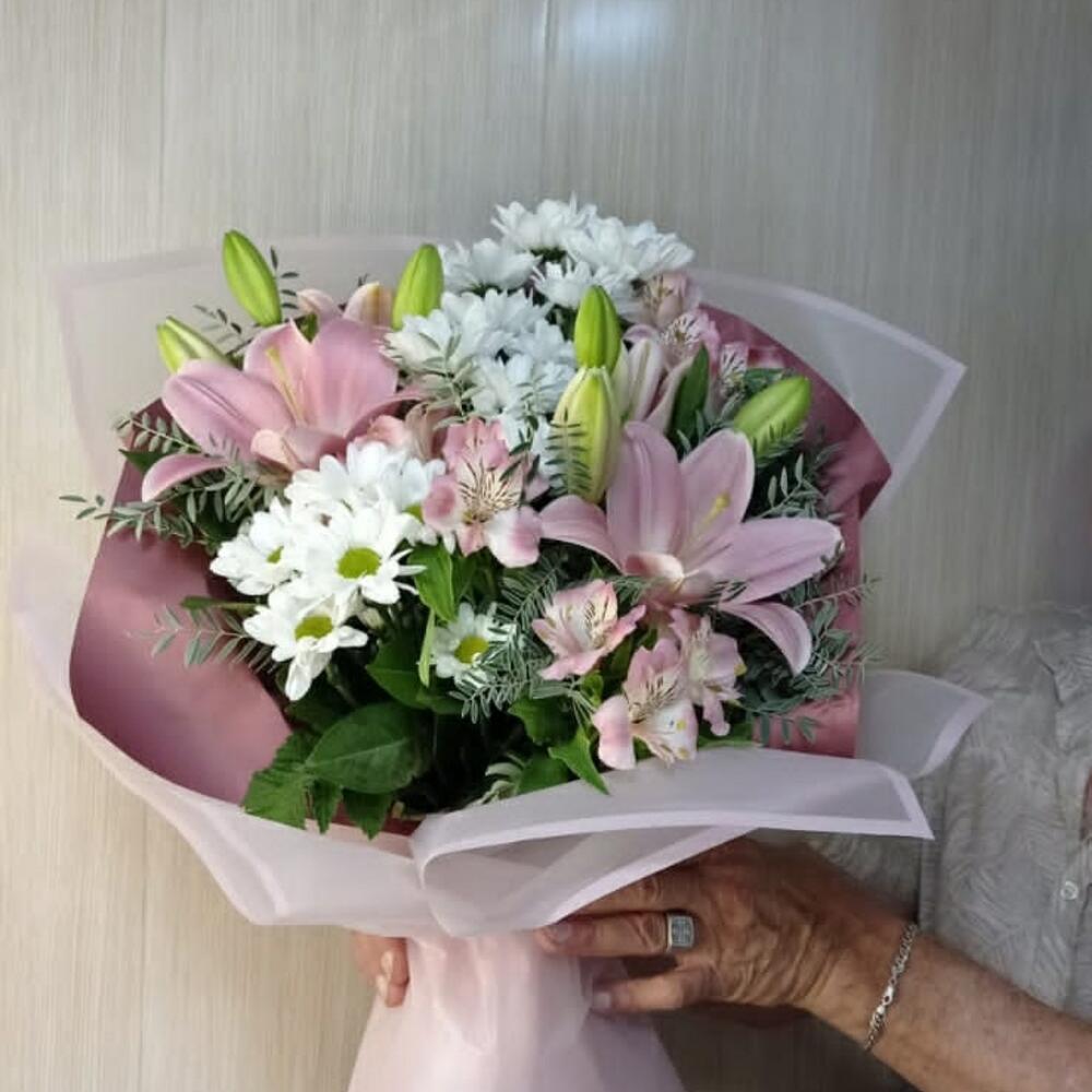 Pink lily - 2 pcs Chrysanthemum bush chamomile - 3 pcs альстромериямикс европа - 4 pcs