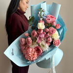 Hypericum - 1 pcs Hydrangea - 1 pcs Delphinium - 1 pcs Eucalyptus - 1 pcs Chrysanthemum - 1 pcs Dianthus - 2 pcs peony - shaped roses - 2 pcs bush roses - 5 pcs