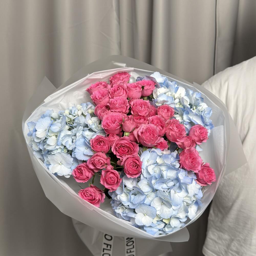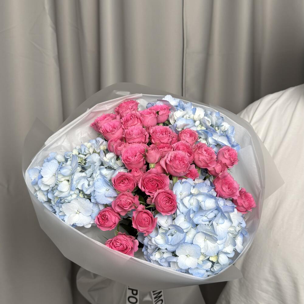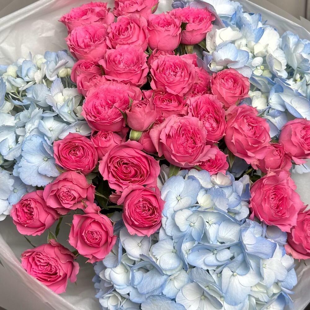 Hydrangea - 3 pcs Bush rose - 5 pcs Designer packaging - 3 pcs
