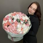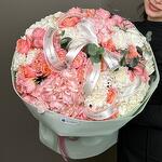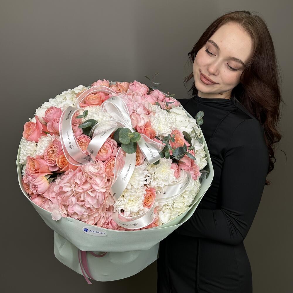 Hydrangea - 6 pcs Eucalyptus - 2 pcs Rose - 15 pcs Bush rose - 5 pcs Chrysanthemum - 4 pcs aqua paper - 1 pcs