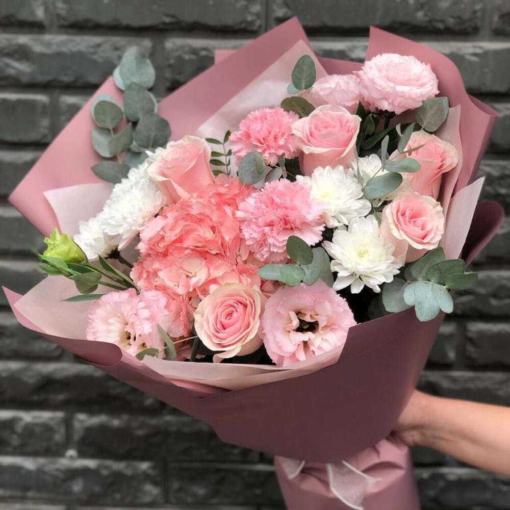 Hydrangea - 1 pcs Lisianthus - 3 pcs Chrysanthemum bush - 2 pcs Rose - 5 pcs Dianthus - 2 pcs