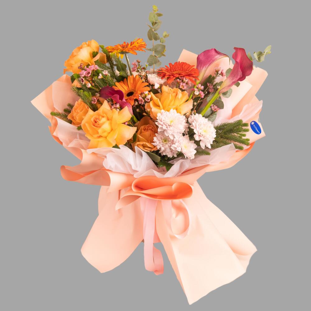 Brunia - 3 pcs Waxflower - 3 pcs Eucalyptus - 3 pcs Rose - 5 pcs Chrysanthemum - 2 pcs Gerbera - 3 pcs calla lilies - 3 pcs