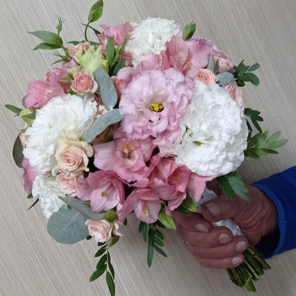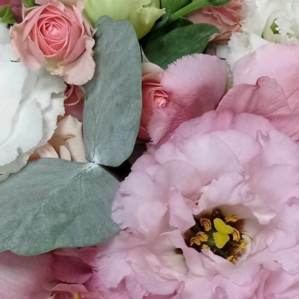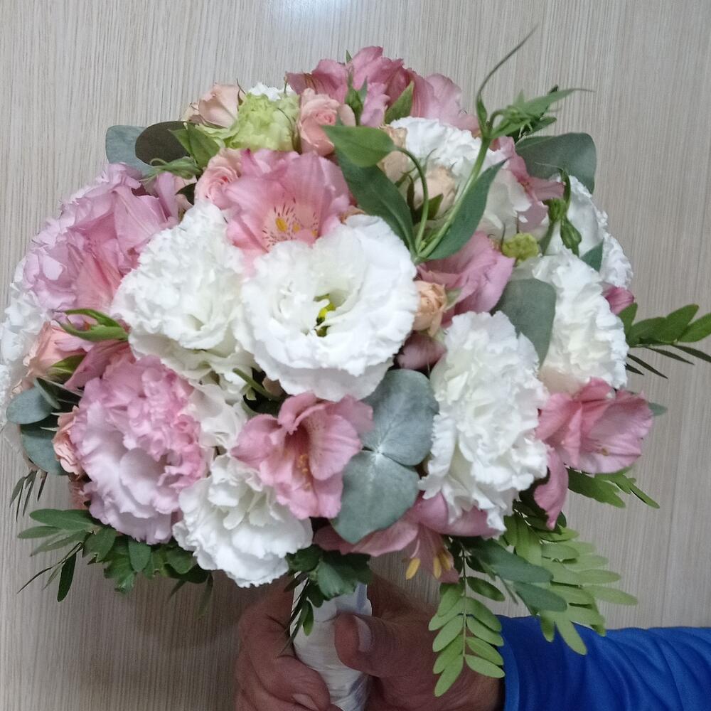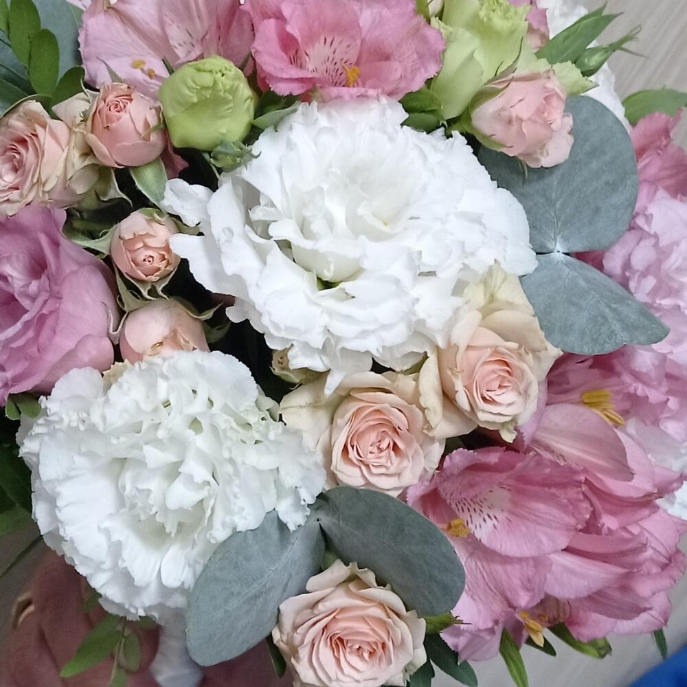Rose bush pink - 5 pcs Lisianthus Alisa white - 6 pcs Eucalyptus Baby Blue - 3 pcs альстромериямикс европа - 4 pcs