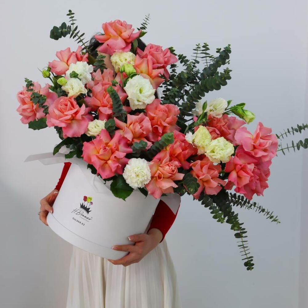 Eucalyptus - 3 pcs Rose - 21 pcs Carnation - 3 pcs Eustoma - 5 pcs Box - 1 pcs