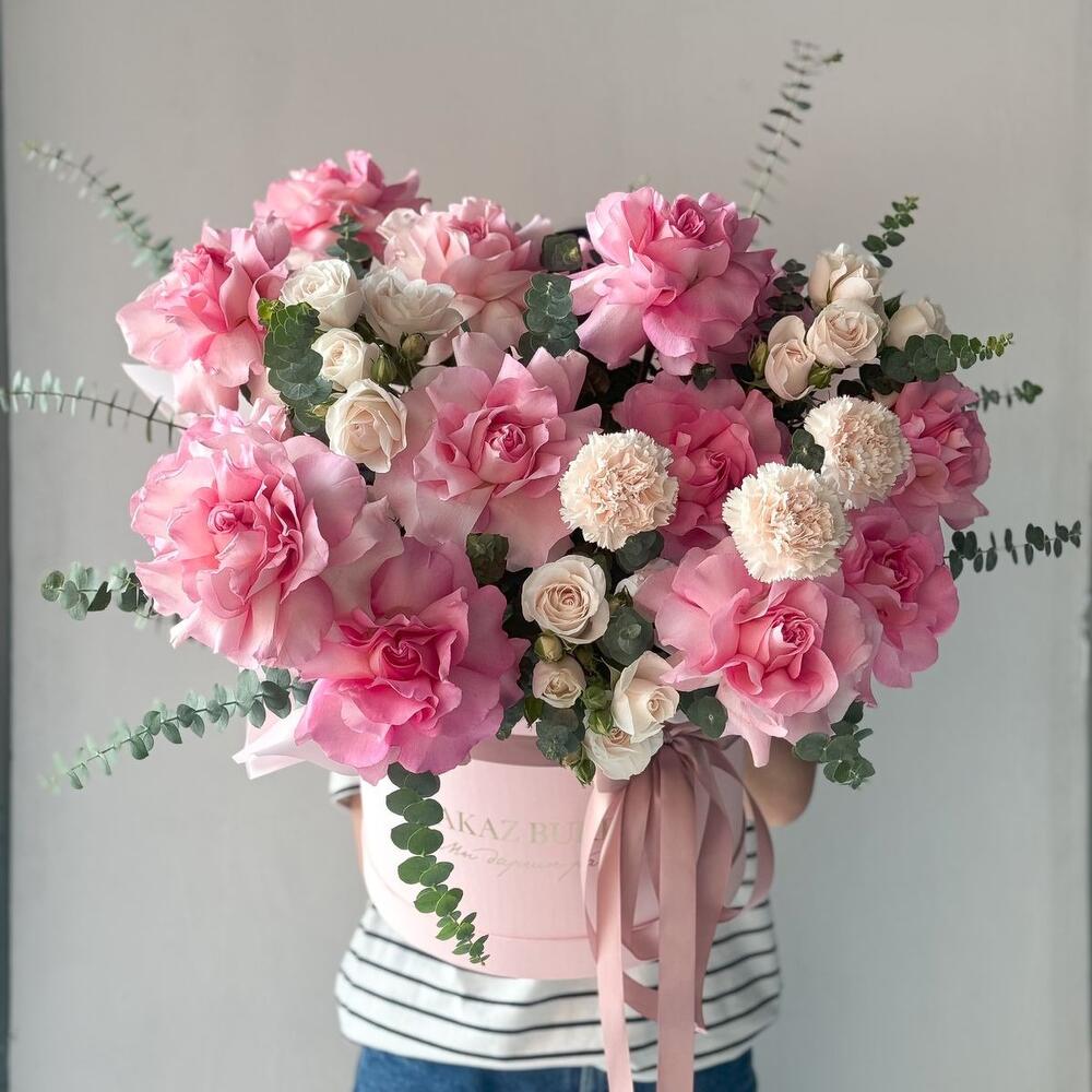 Открытка-1шт. Коробка стандартная 1шт. Эвкалипт (Голландия)-2шт. Гвоздика (Голландия)-3шт. Роза голландская 60 см-15 шт. Спрей роза (Кения)-3 шт.