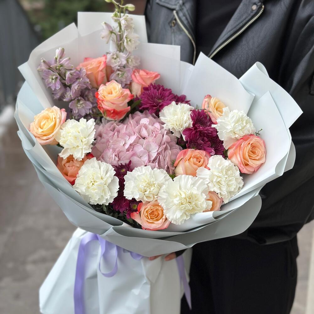 Hydrangea - 1 pcs Matthiola - 2 pcs Chrysanthemum bush - 3 pcs Dianthus - 7 pcs roses - 11 pcs