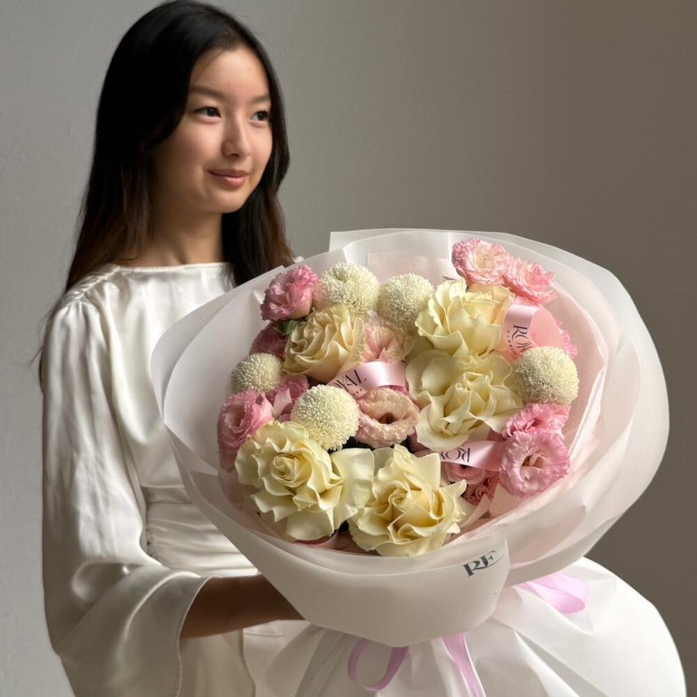Изысканный букет в пастельных тонах с белыми розами, пушистыми шариками и розовыми эустомами — как утро, наполненное спокойствием и добротой. Идеален для утончённой и нежной особы.
