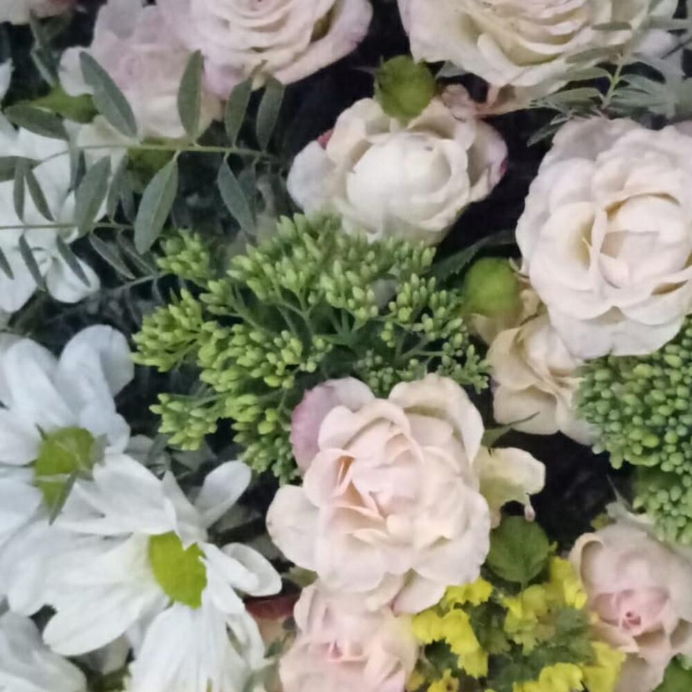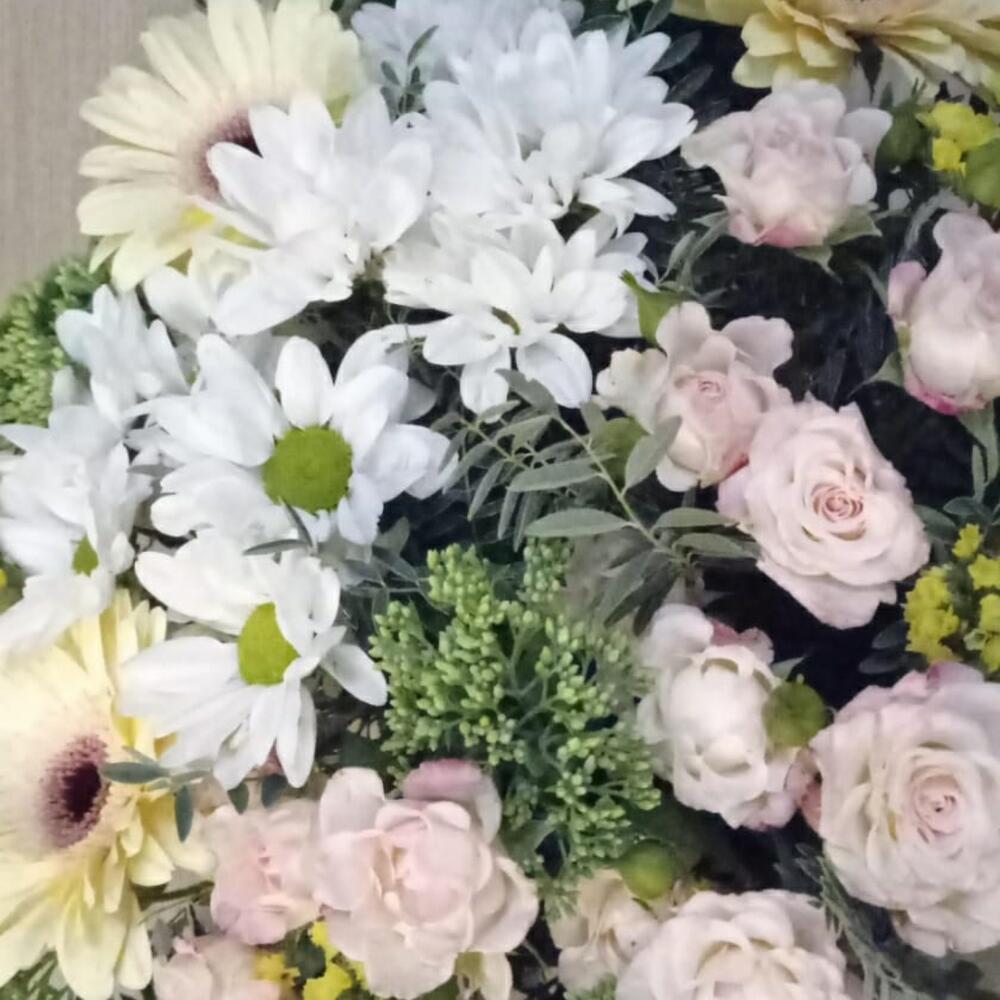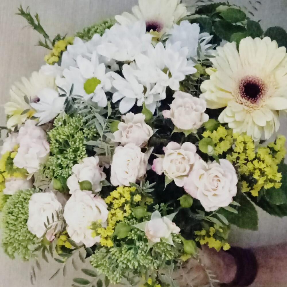 Chrysanthemum bush - 2 pcs Gerbera - 3 pcs Spray rose - 3 pcs statice lemon - 4 pcs